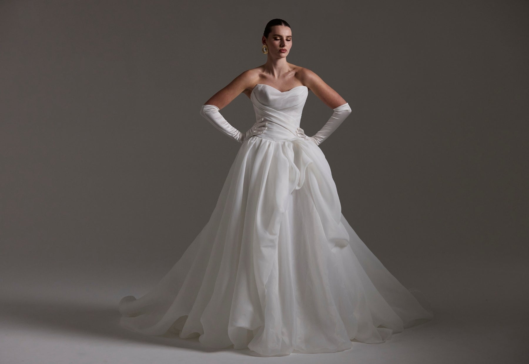 Introducing Lustre, our newest Atelier Wu collection which redefines modern romance with a bold, fashion-forward edge. Featuring sleek two-piece ensembles, artfully pleated chiffon, and dramatic, voluminous skirts,