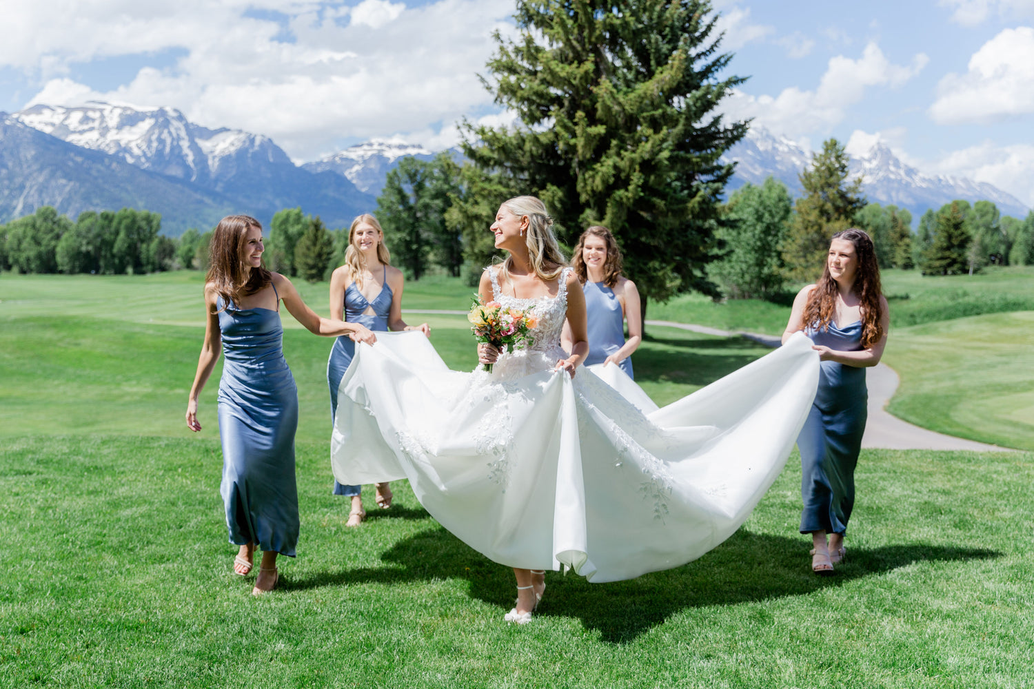 Balance the vibe: Is your gown detailed to the max with elements such as beaded lace? Consider a more minimalistic style for your bridesmaids' dresses to accompany yours perfectly.