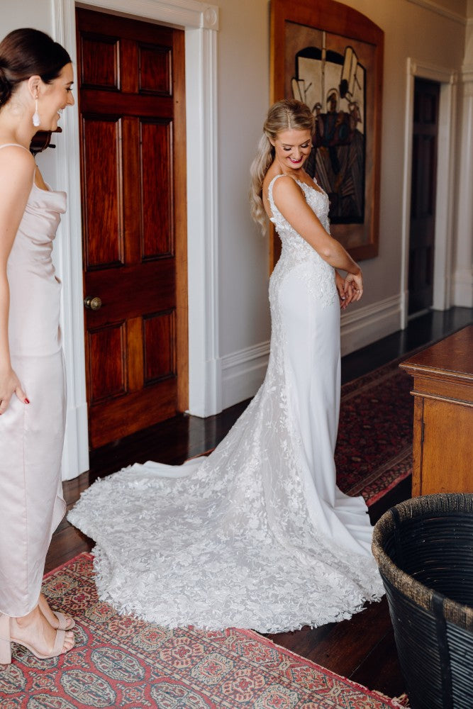"Choosing my wedding dress was so hard! It was probably the most stressful part of the wedding. I researched what each store carried before going in and trying them on – I really wanted something quite unique. When I first tried my Jessica Couture dress on it wasn’t fully made so they pinned me into it, and I just fell in love! Trying it on the second time when it was completed certainly helped me make my mind up! The dress wasn’t named at the time and we joked about naming after me, but Jessica Couture actually did which was super special! The fit and flare dress was made in a sparkly floral lace with a plunge neckline and was paired with my sister’s veil and pink block heels."