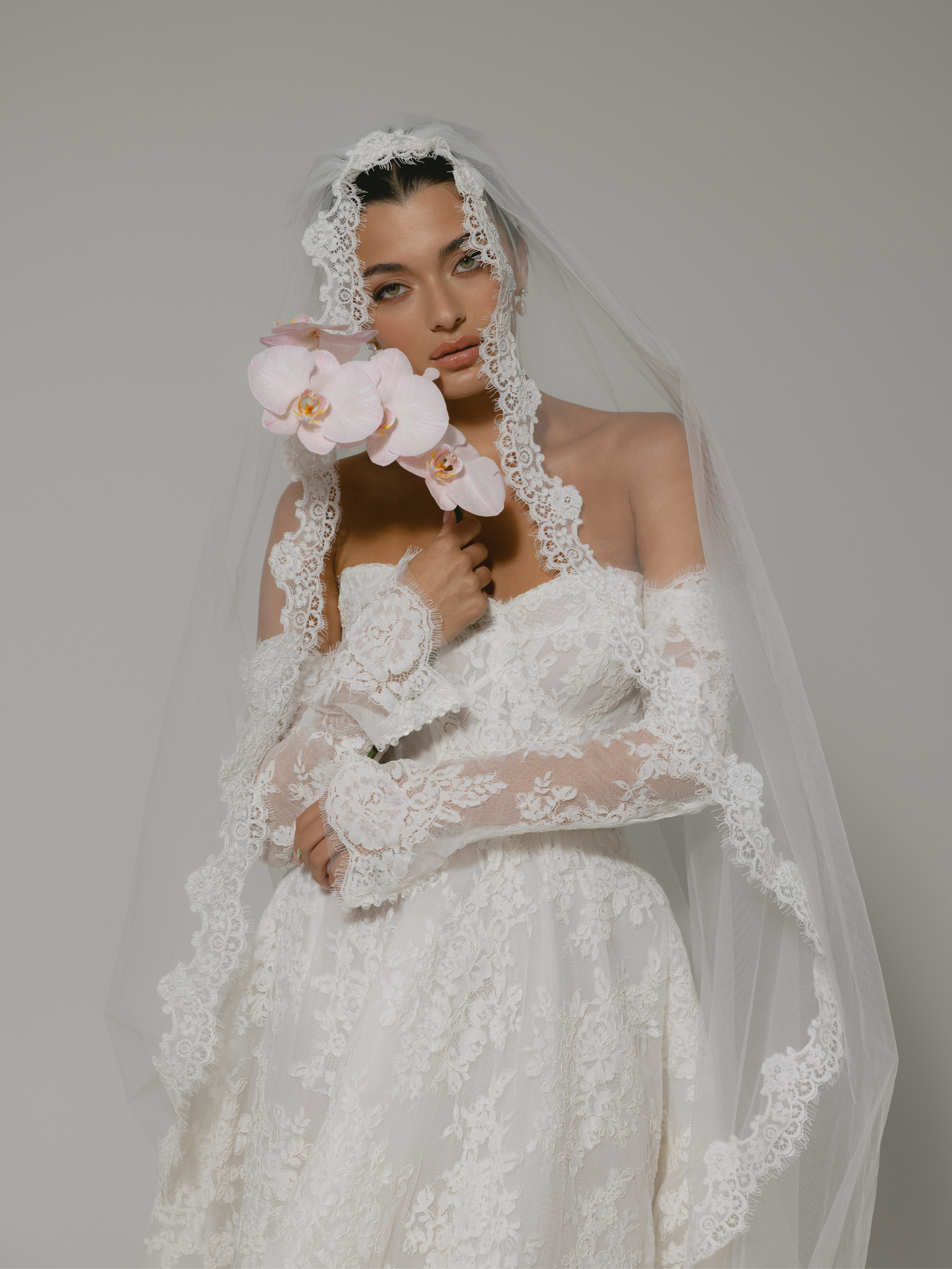 Expect sculptural corsets paired with voluminous skirts, forming statement-making two-piece bridal ensembles which redefine contemporary couture. Accessories take a leading role too: sweeping mantilla veils edged in intricate lace, overjacket pieces adding that touch of drama and versatility, and romantic lace chokers which echo the elegance of bygone eras. Stay tuned for the official release!!