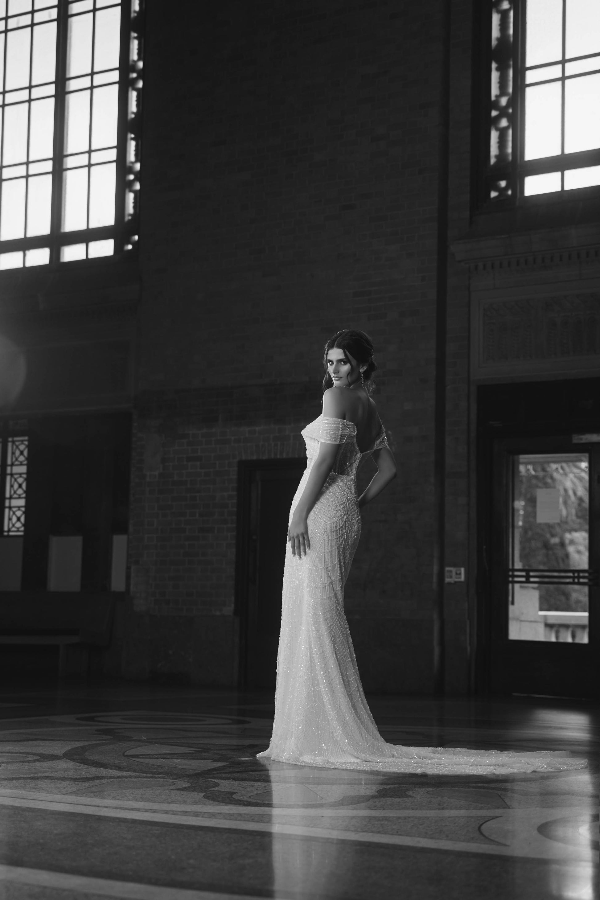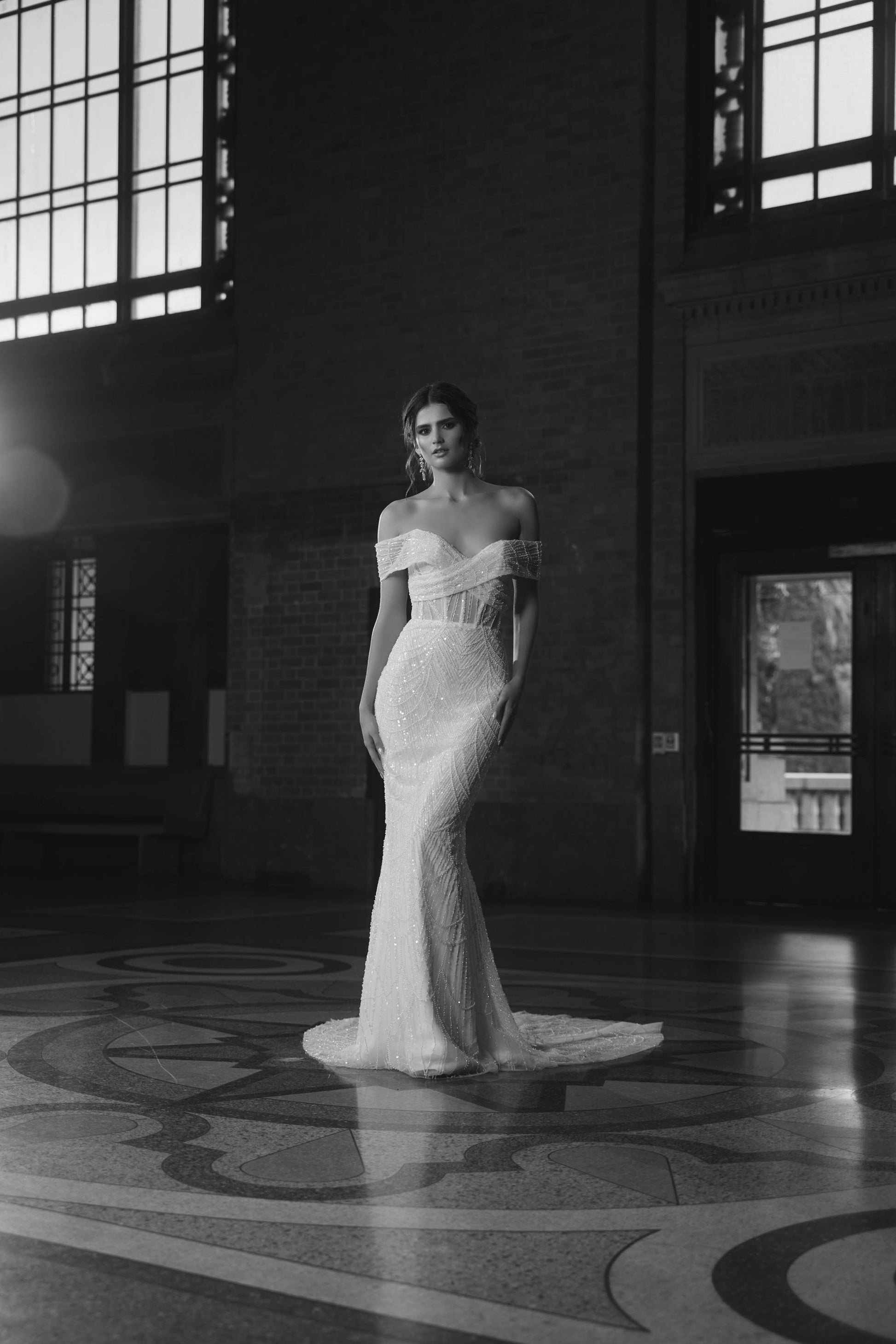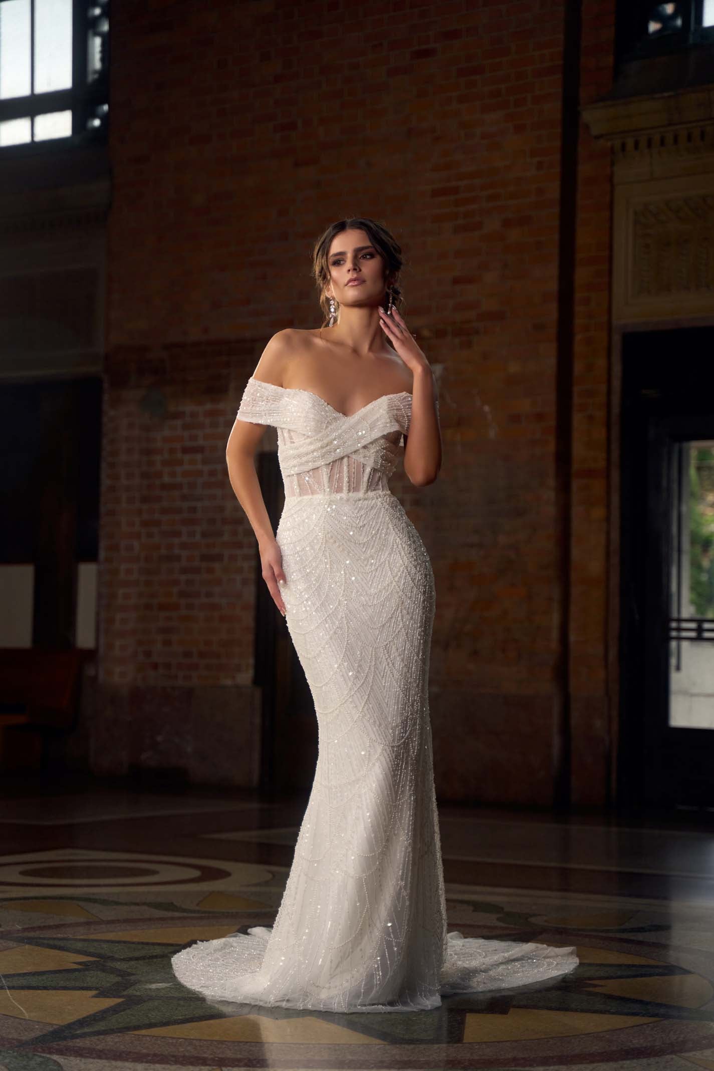 Beata emerges as a richly adorned gown with an all ivory shimmer, conceived with a sophisticated contemporary approach. Her off the shoulder sleeves gracefully intersect the bodice, creating a distinctive allure and exposing an alluring décolletage. The beading imparts an alluring and playful touch. The fit-and-flare silhouette drapes the figure in an elegant manner, Beata truly epitomizes refinement and sophistication. She is crafted from our signature beaded and boasts a corset-style top that fits impeccably due to its well-structured internal boning.