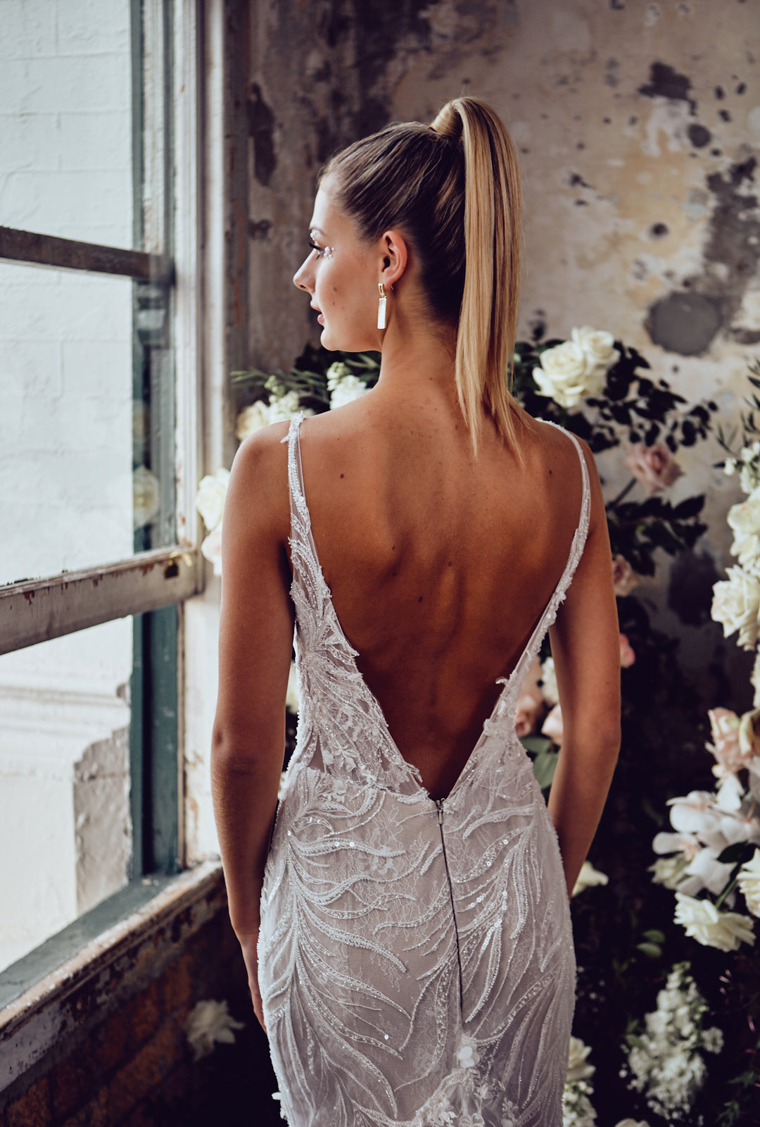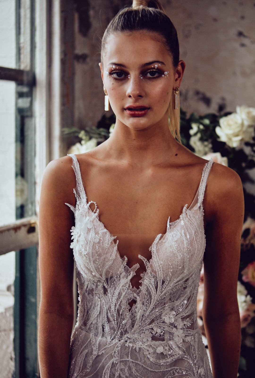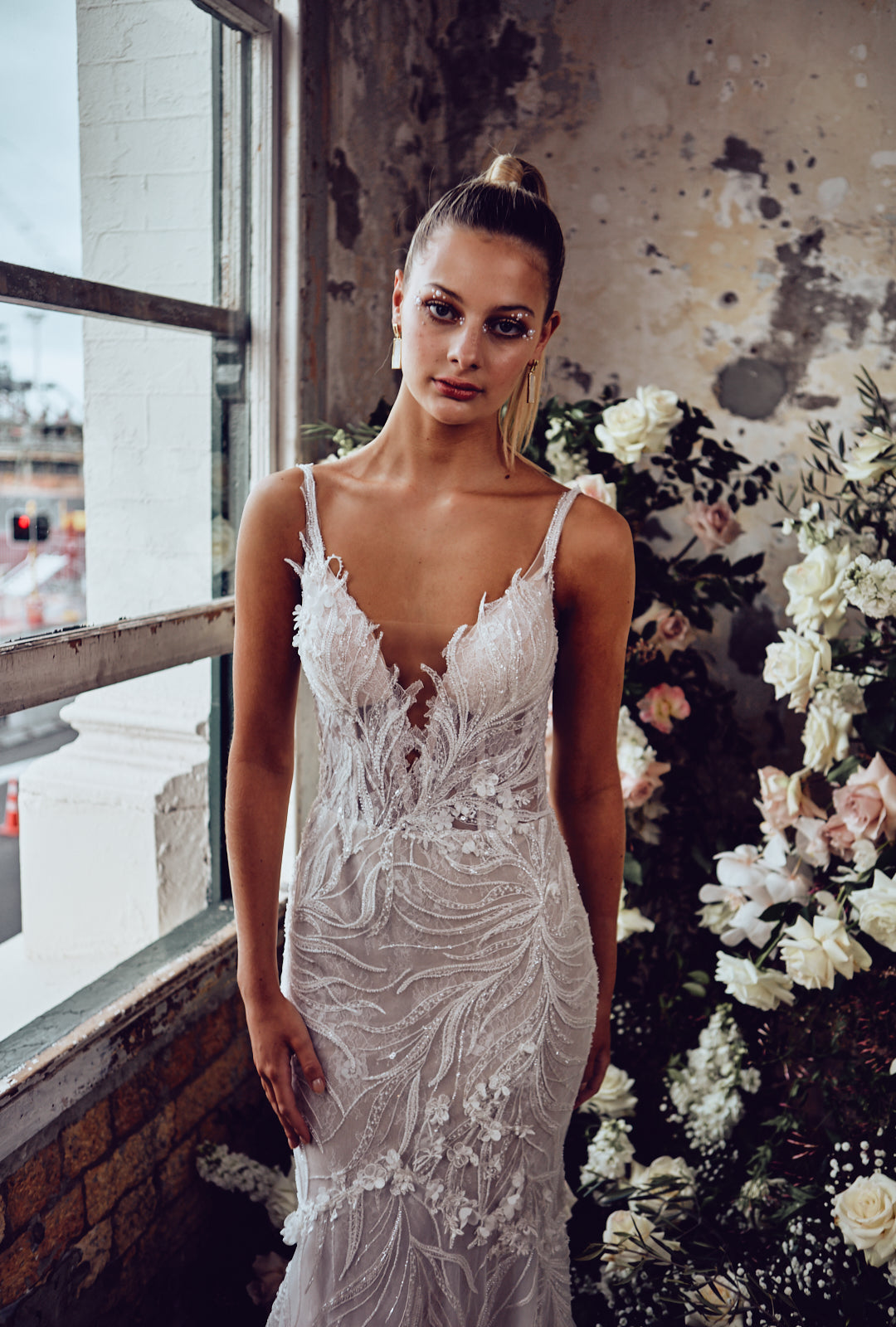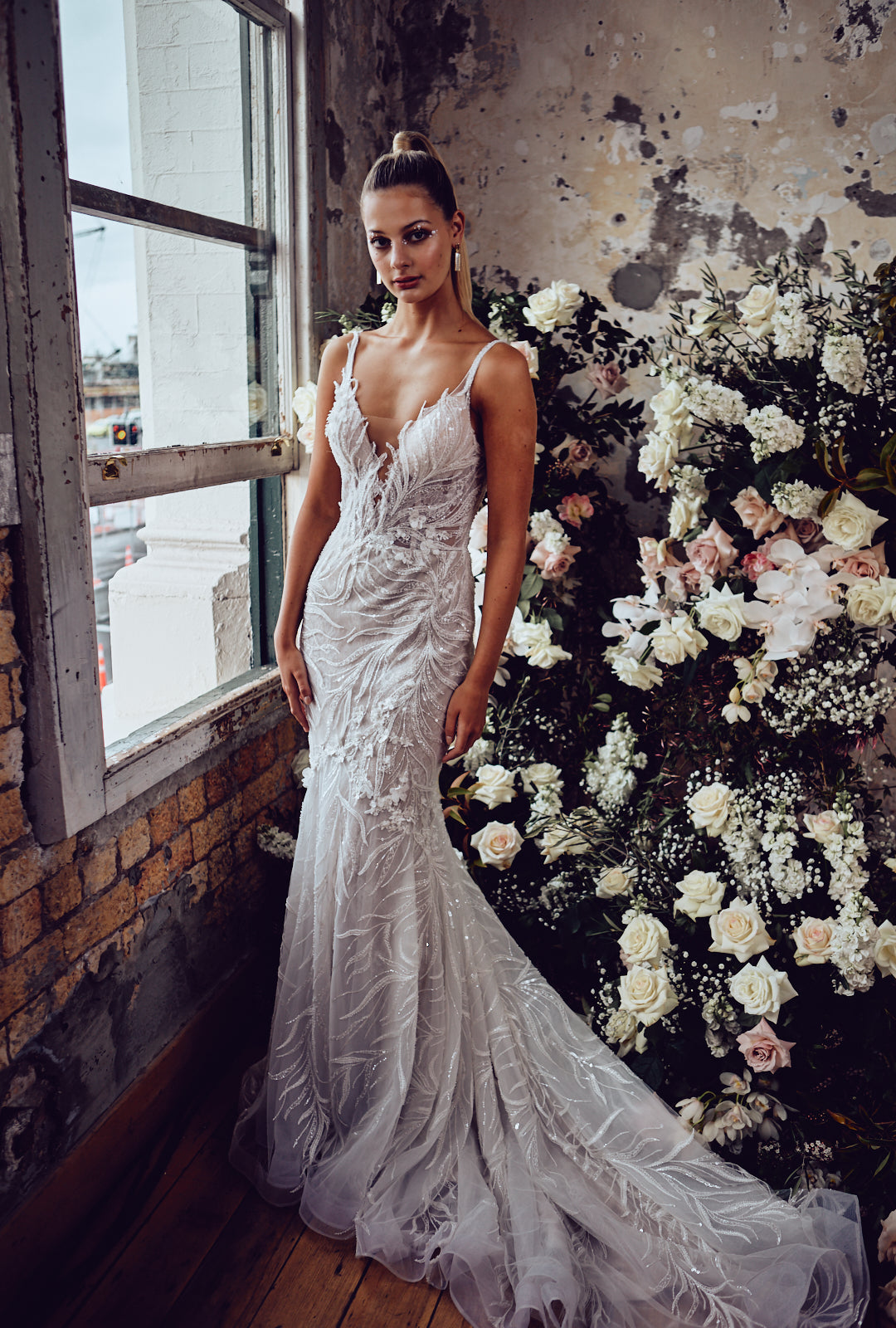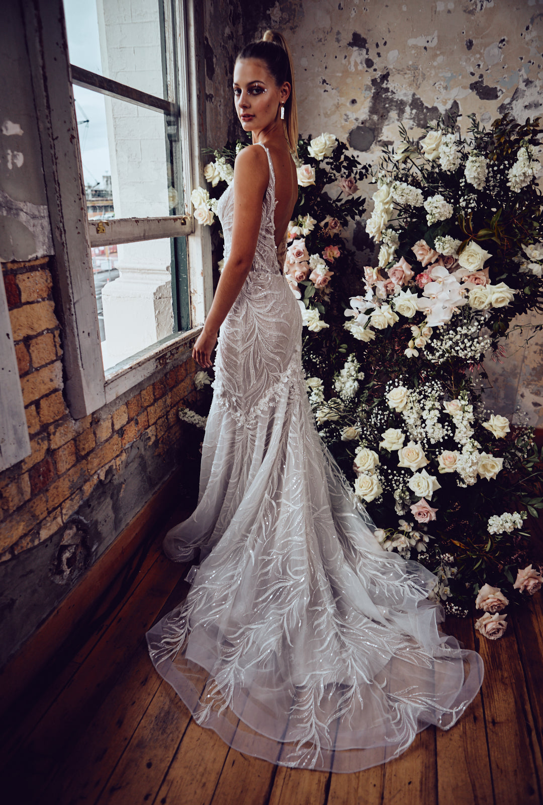 It really doesn't get prettier than this. Jae is a certified stunner, covered in feathery lace resembling leaves, her mermaid skirt hugging your hips and fanning out behind in a small court train. Feminine and pretty, the V-plunge front and back add allure.
