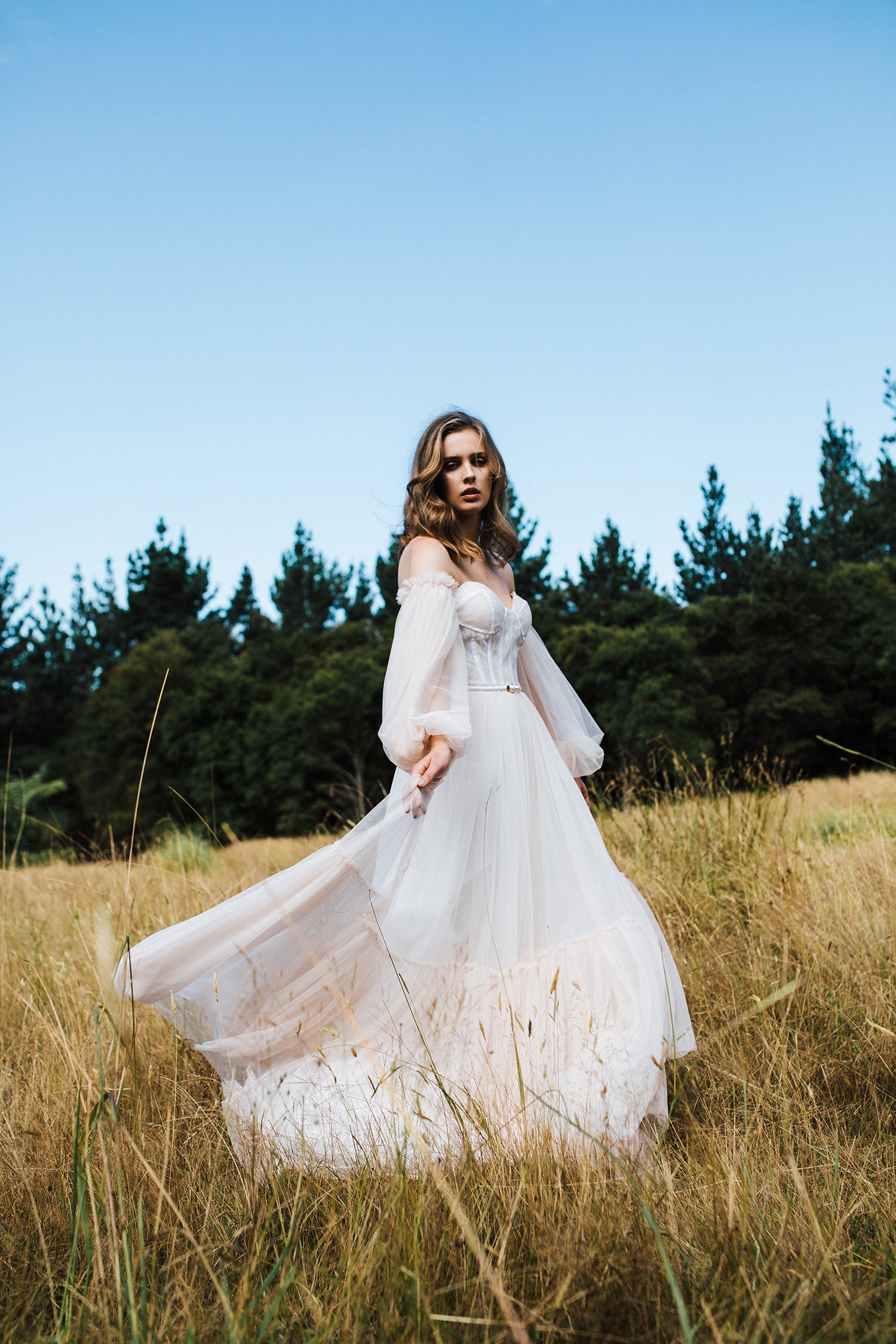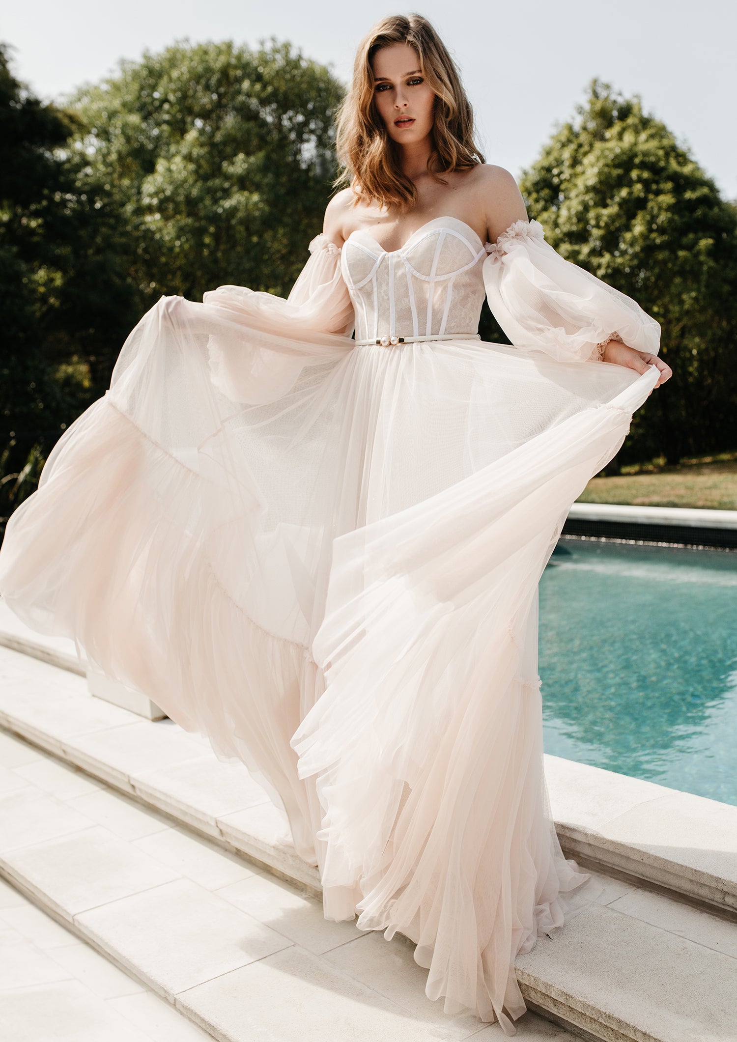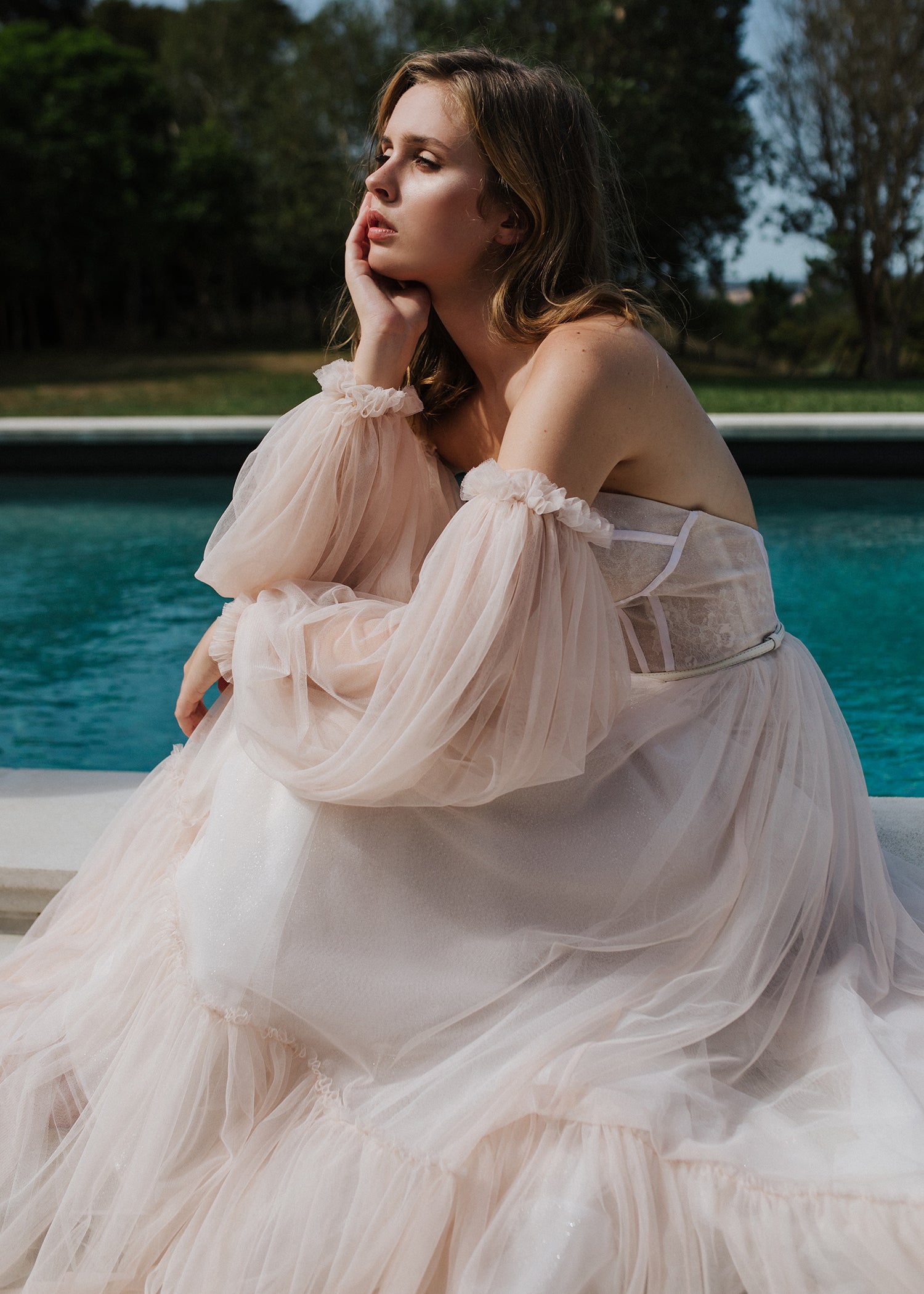 Fashioned in soft pink tulle with diaphanous layers of sparkle lace permeating through her playful and voluminous silhouette. Designed with extra layer of frill at the skirt bottom and styled with billowing detachable sleeves lend her a bourgeois boheme vibe. Her delicately structured bodice is complemented by the subtlety of the pink lace. Sleek white leather belt cinches at the waist, transforming Natalia into a contemporary classic.