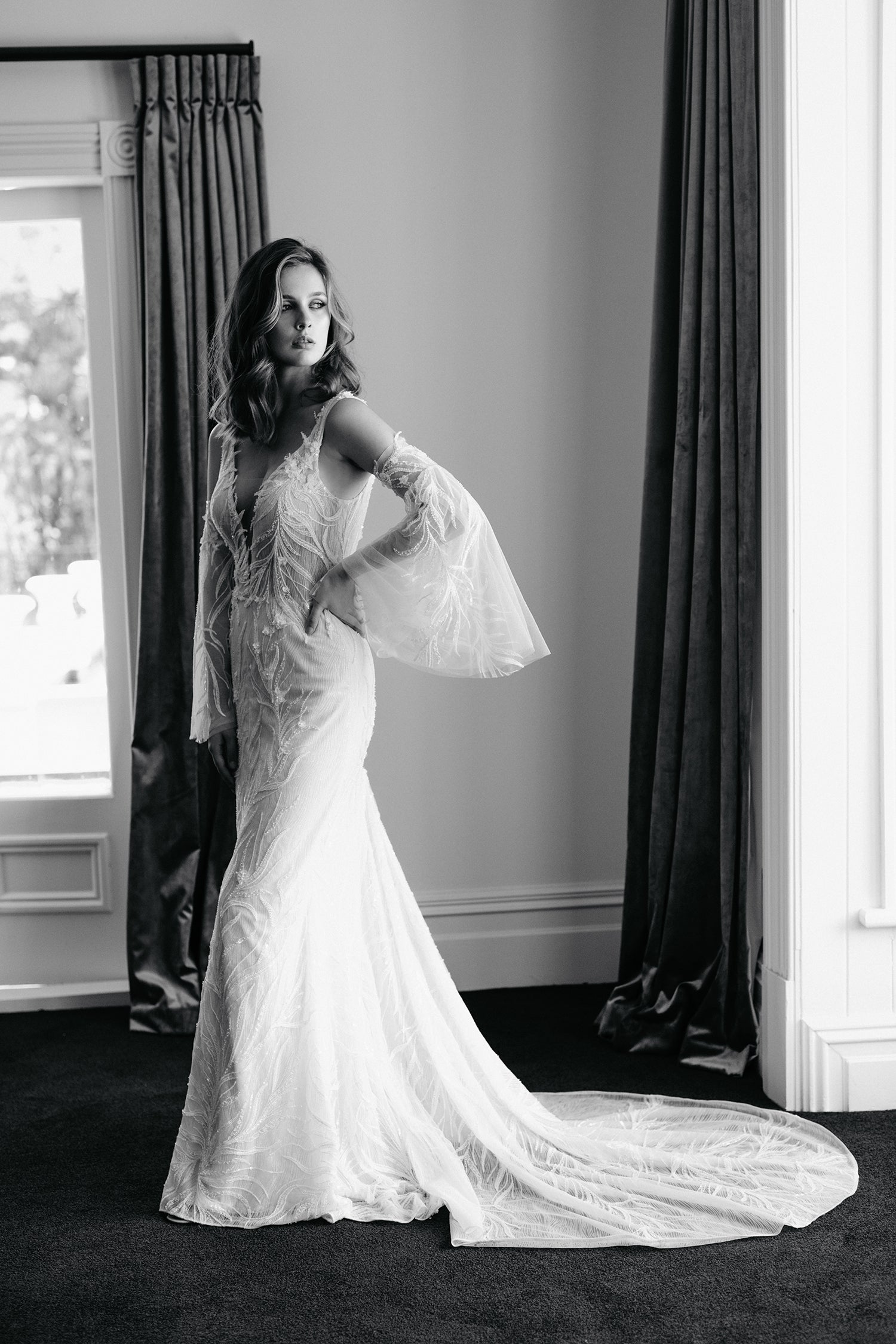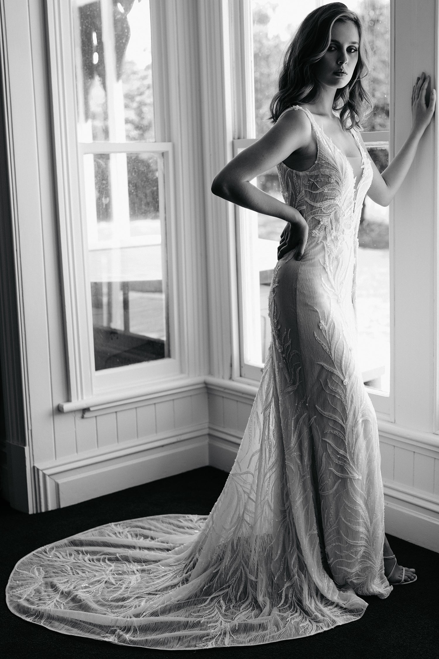 Flowing gracefully into a short court train, her elegant sheath silhouette is perfect for the bride seeking something both classy and alluring