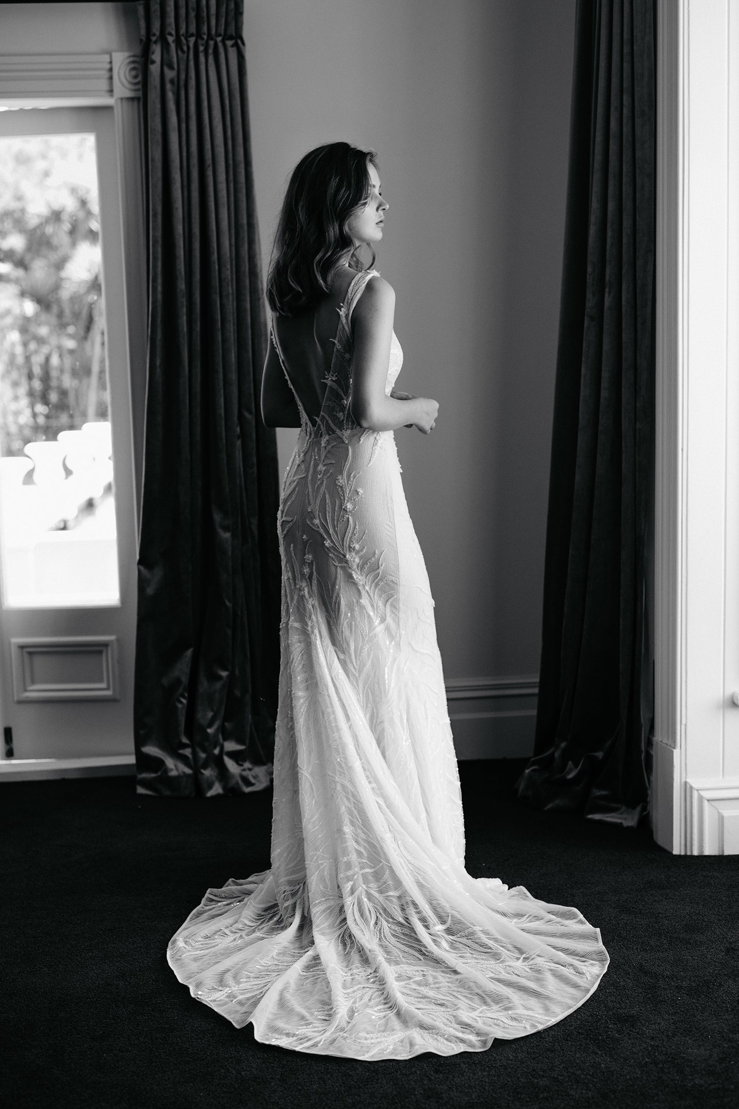 Sultry, and feminine, Nicolette stuns with her deep V plunge front and back, covered in the same leafy beaded lace as her sibling Jae.