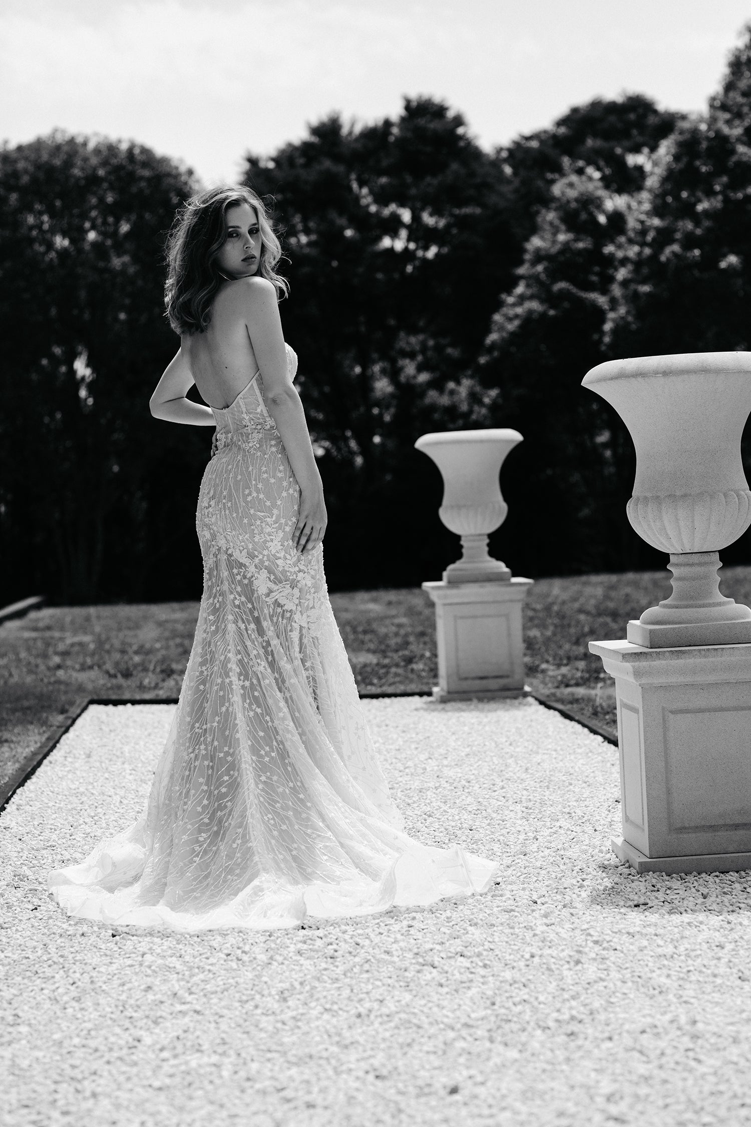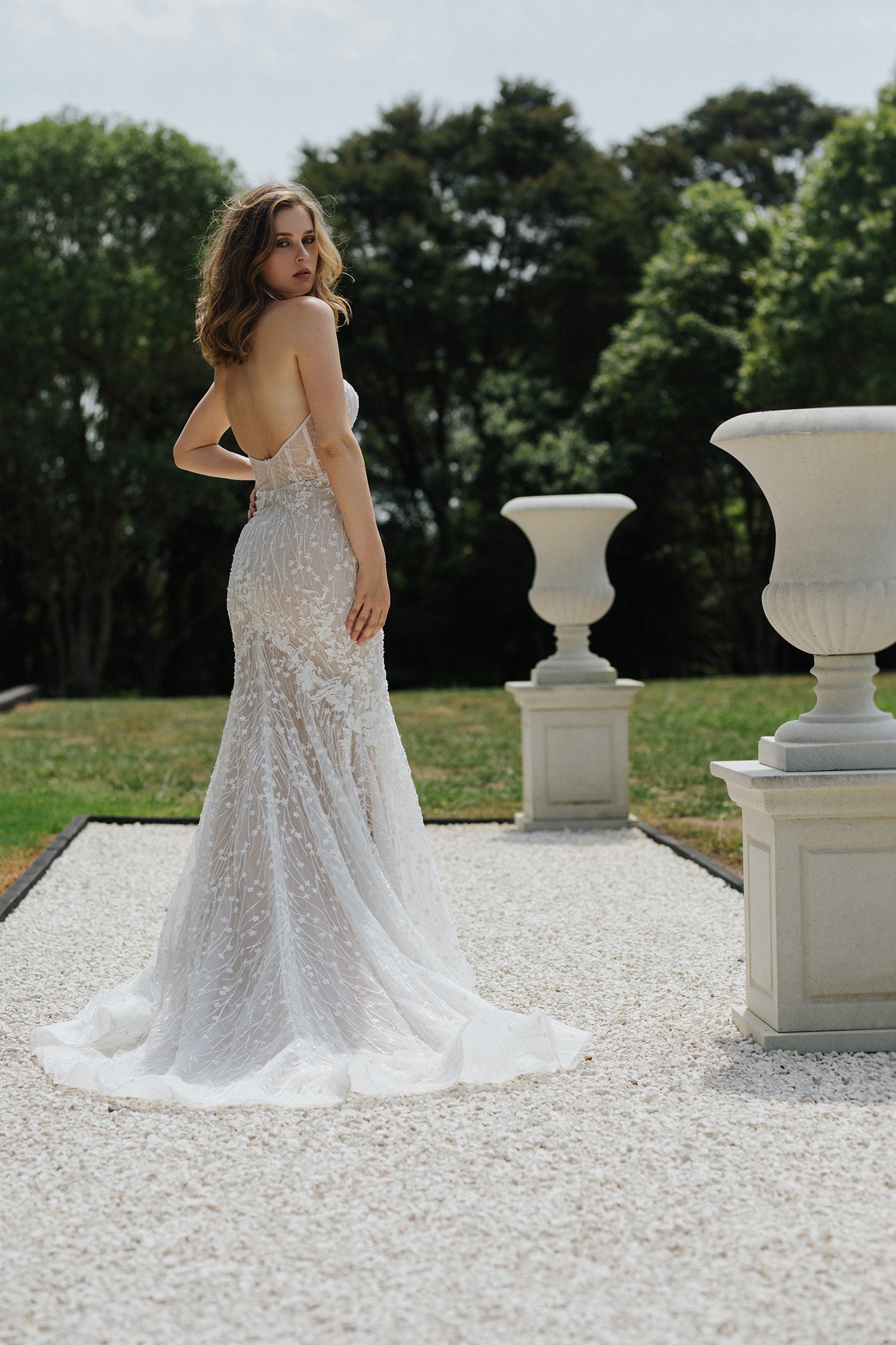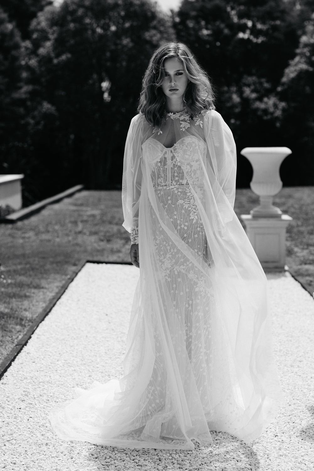Norah is sweet and delicate, covered in tiny floral lace which pop in the champagne lining. Her soft sweetheart neckline is supported by a corseted bodice which flows gracefully into a mermaid skirt. Paired with a soft tulle cape, she is a whimsical forest princess.