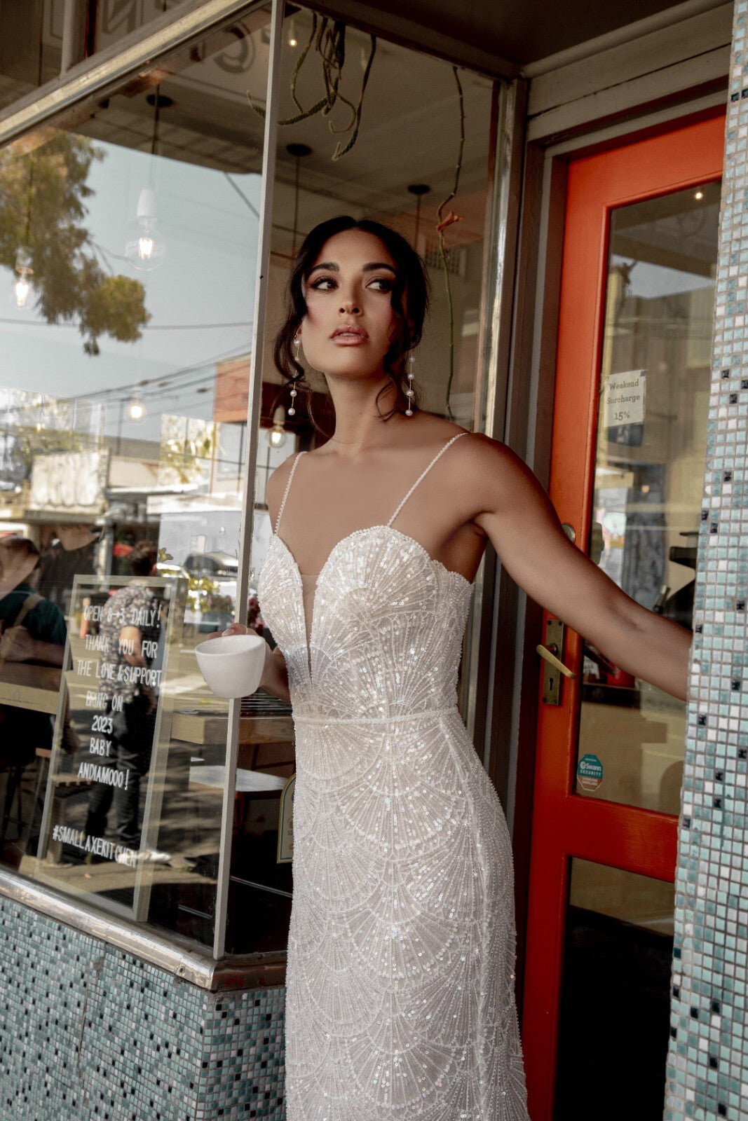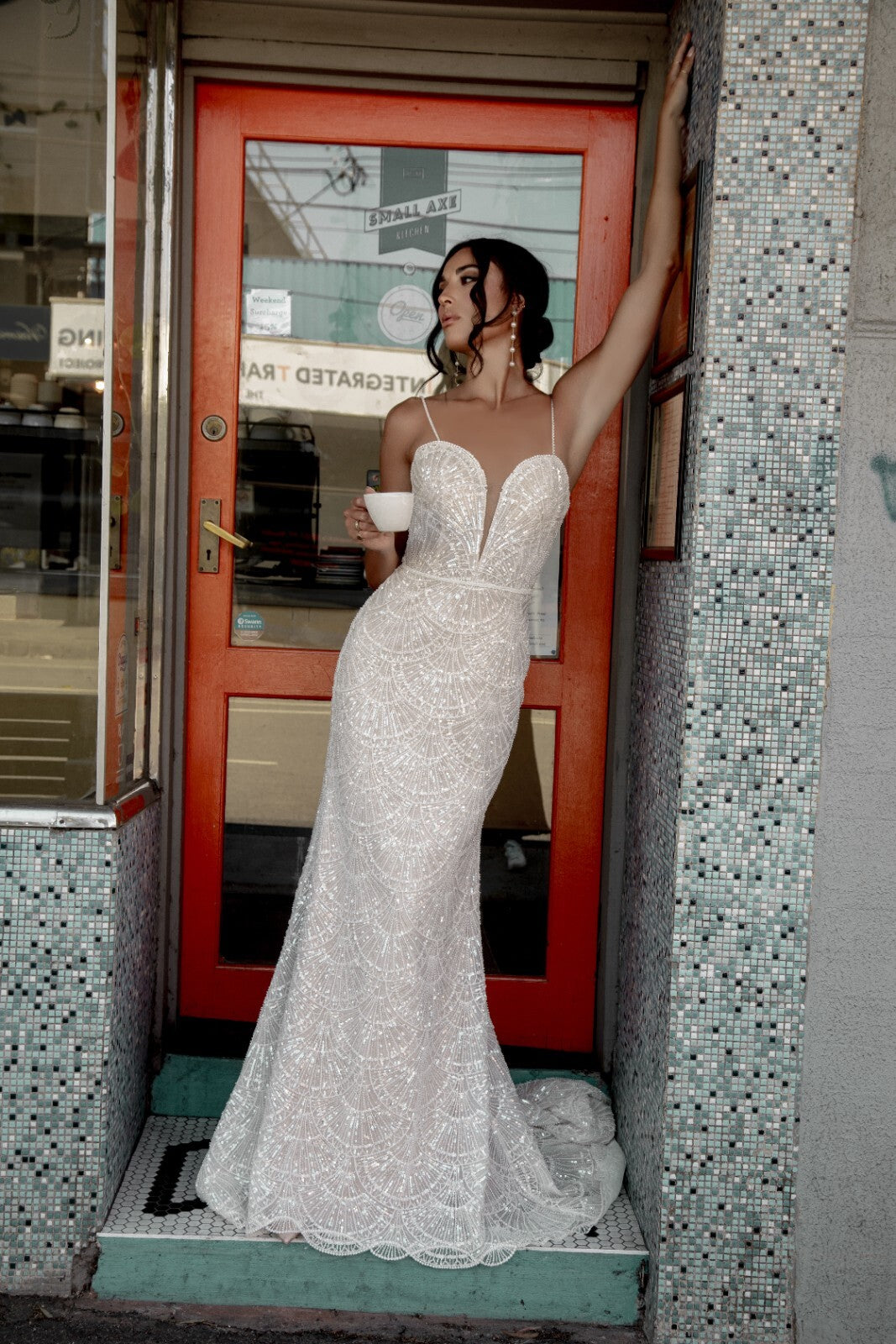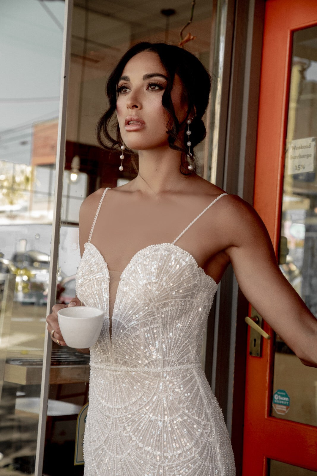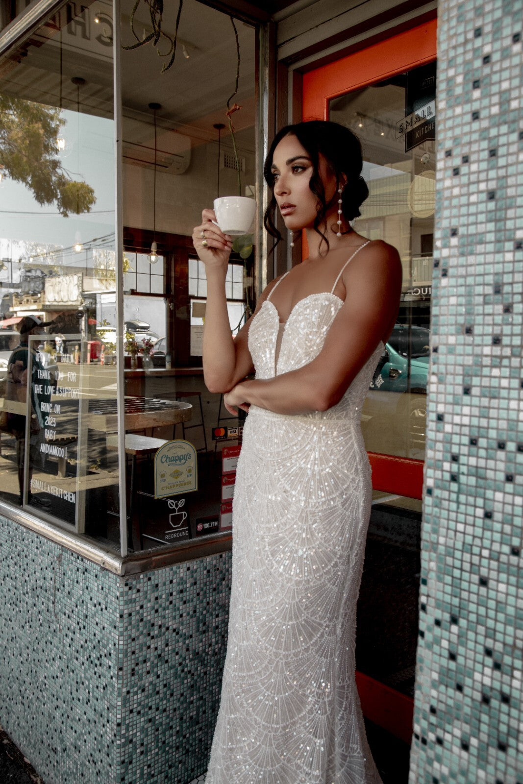Embodying the full glitz and glamour of the 1920s Art deco era, this fully beaded gown is reminiscent of a mermaid, with her fit and flare silhouette and fish scale pattern. Glittering and sparkling from all angles, Rena is simply the star of the show!