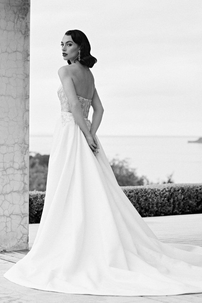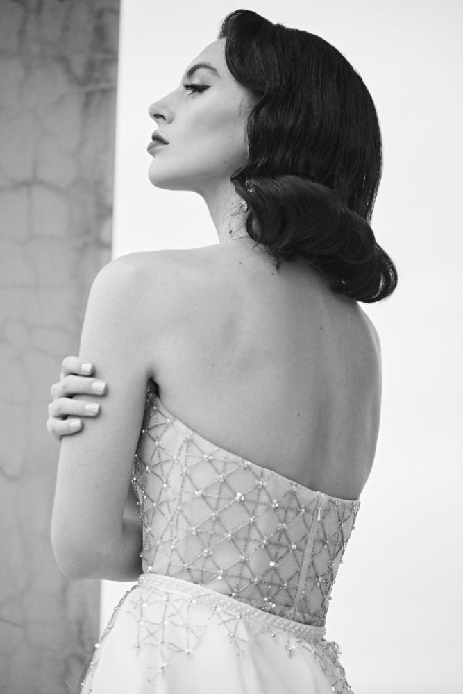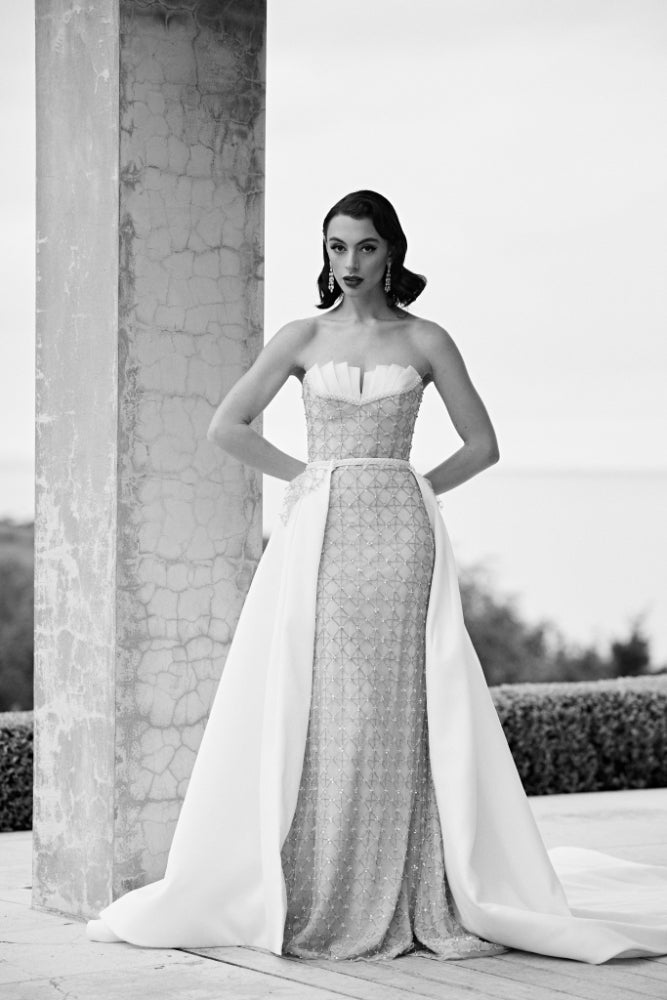 Every feature of our Theodora gown will leave you speechless - from her sleek sheath silhouette, the antique allure of her sequin and beaded tulle, to her pleated organza and pearl neckline. Theodora is a bold gown for the unique and classy bride.