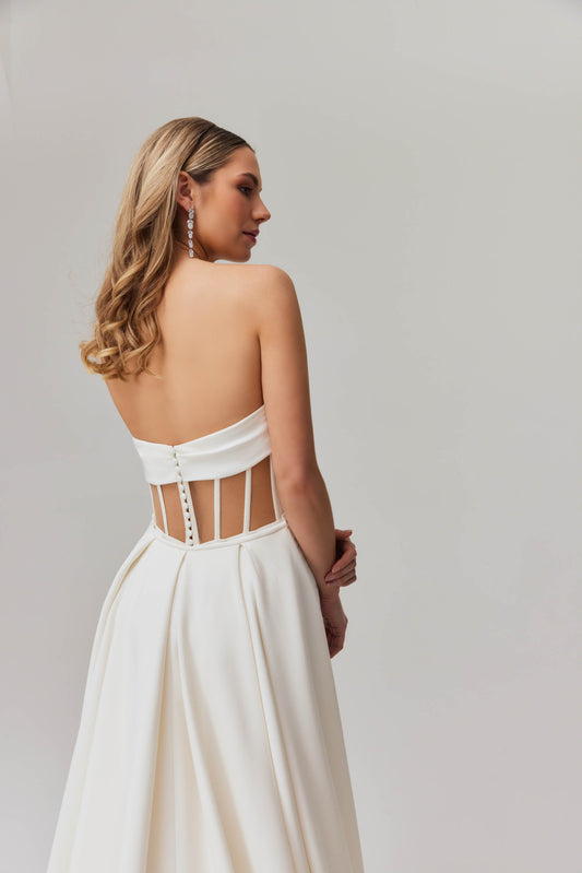 Introducing Lustre, our newest Atelier Wu collection which redefines modern romance with a bold, fashion-forward edge. Featuring sleek two-piece ensembles, artfully pleated chiffon, and dramatic, voluminous skirts, each design captures the essence of structure and softness within Bridal couture.