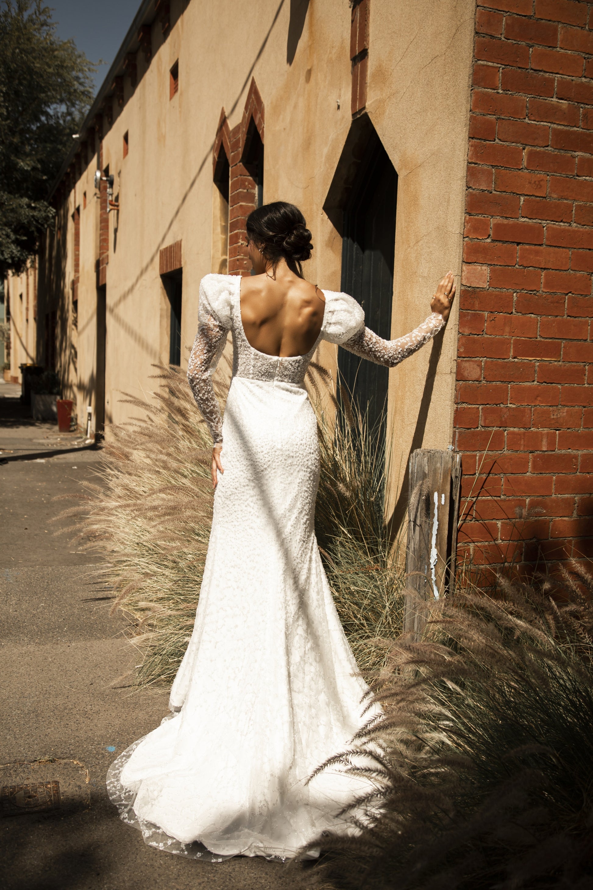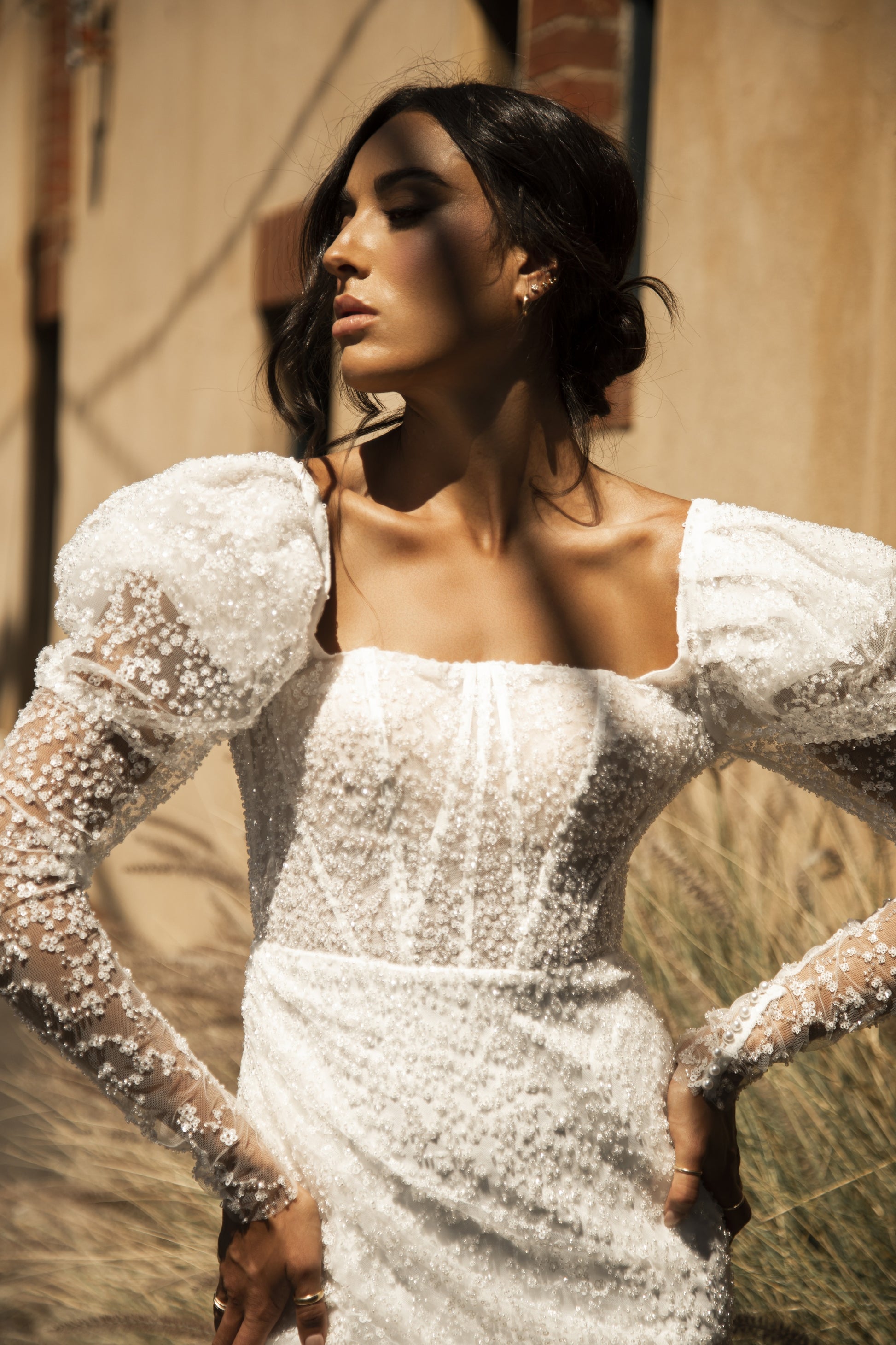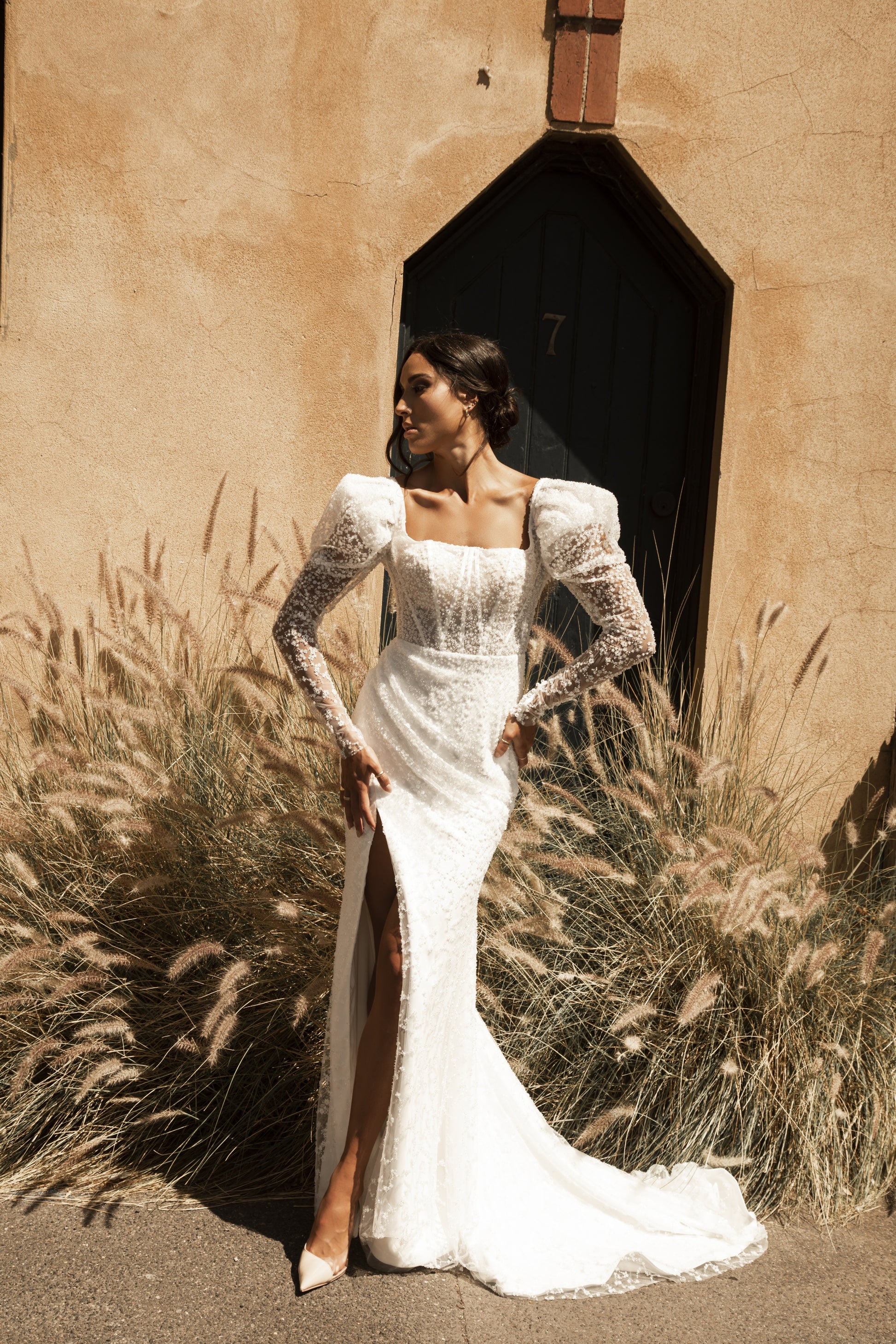 Rachel is a one-of-a-kind gown. From the beautiful square neckline to her boning structure and her puffy shoulder sleeves, she is the perfect combination of modern and luxury in one design. Featuring fully-sequined lace, her fit-n-flare silhouette is designed with a high front slit to help you dance the night away.