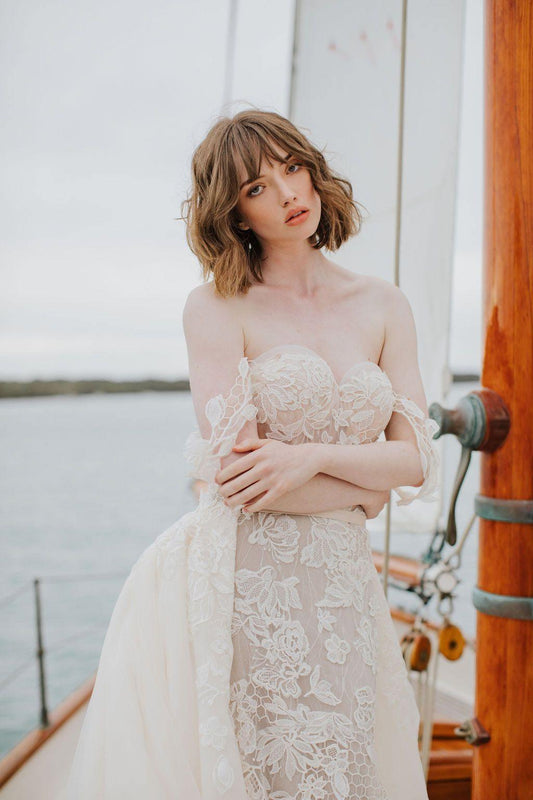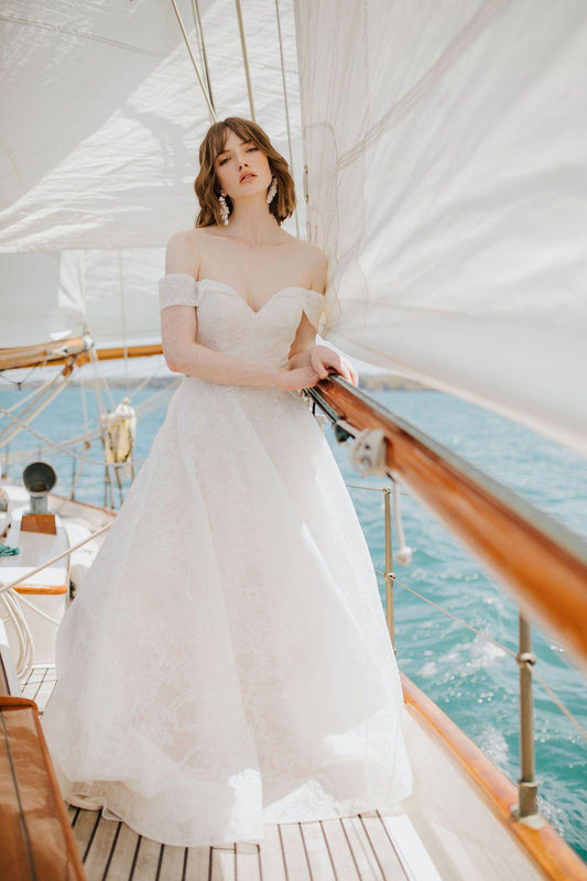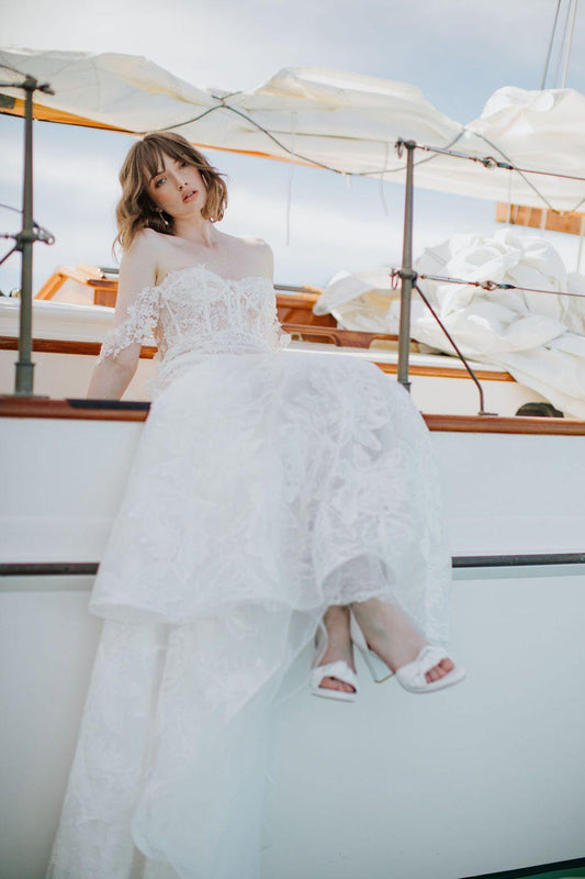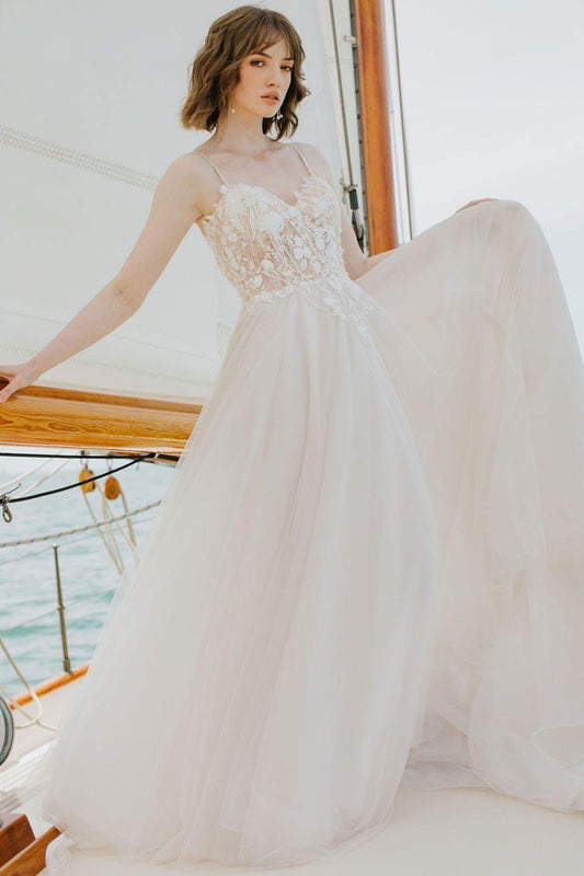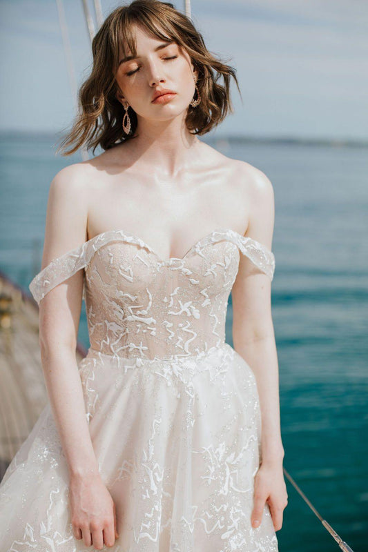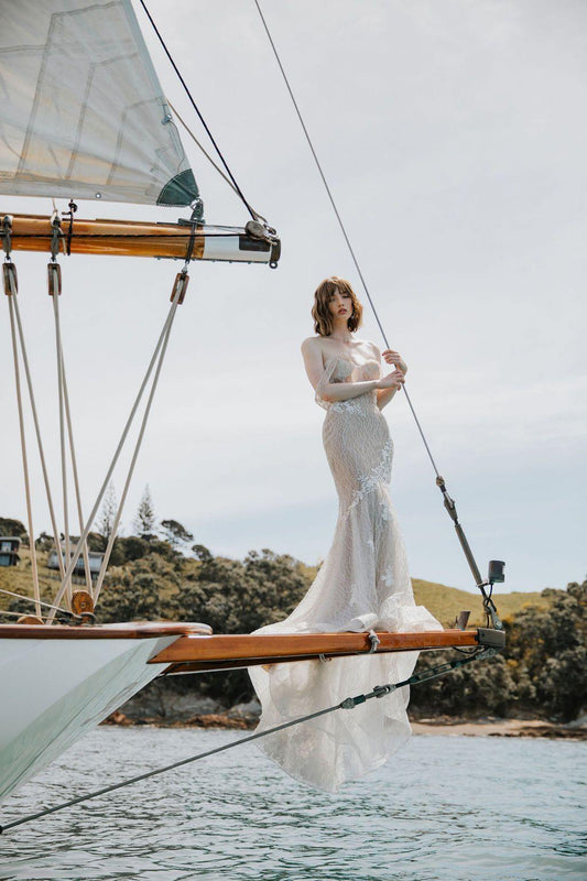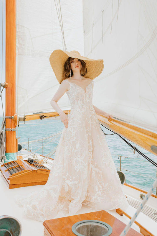 Celebrating the romance of travel, this collection comprises of feminine A-line dresses, unique sparkle and glitter lace, a fashion-forward jumpsuit, showstopping high slits and romantic necklines. Each style is distinct and appeals to a destination wedding bride.