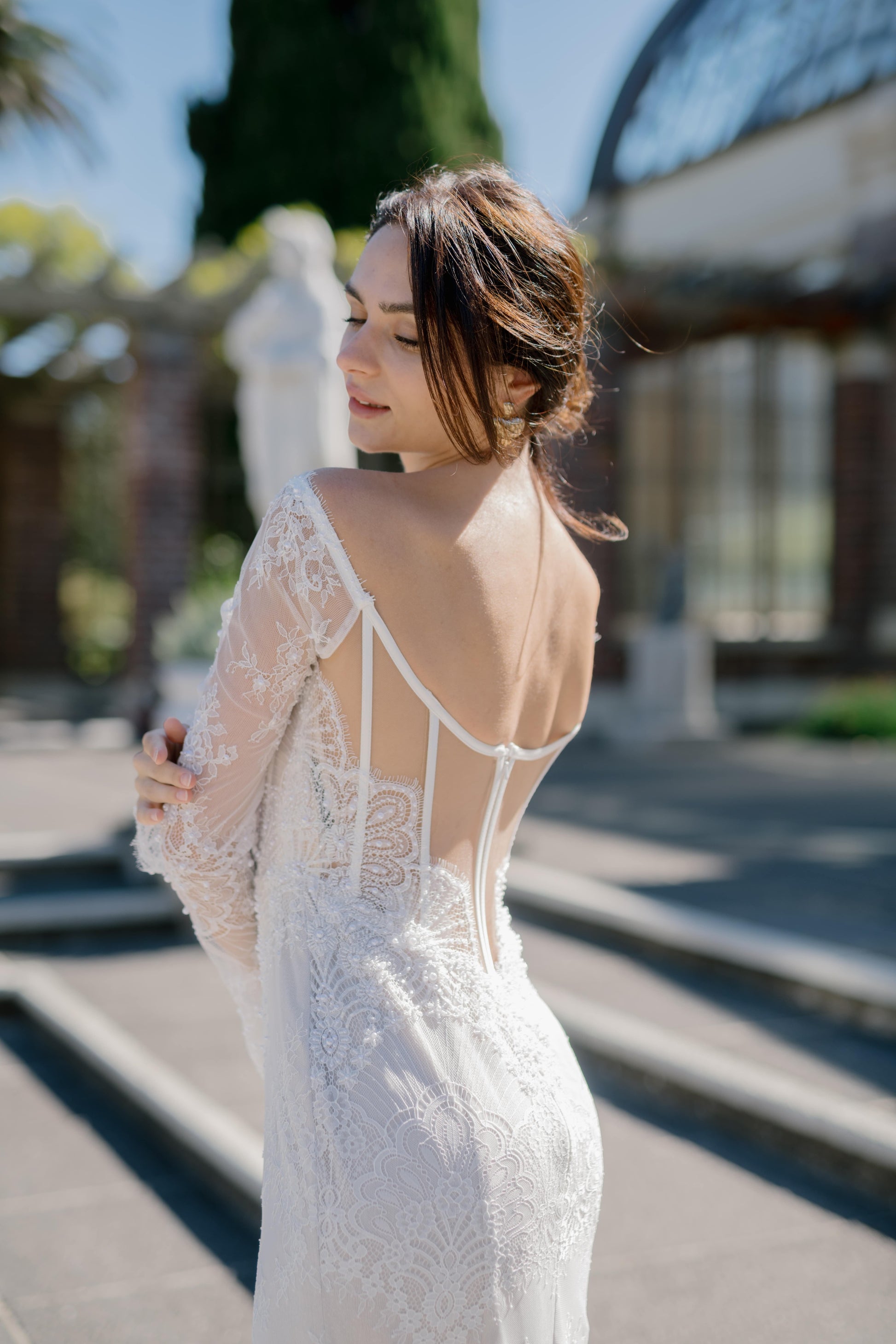 Exposed boning adds structure and shape, while a sheer mesh back leads into a plunging V-back, equal parts sultry and sophisticated. Finishing off with a scalloped lace hem which sweeps gracefully with every step.
