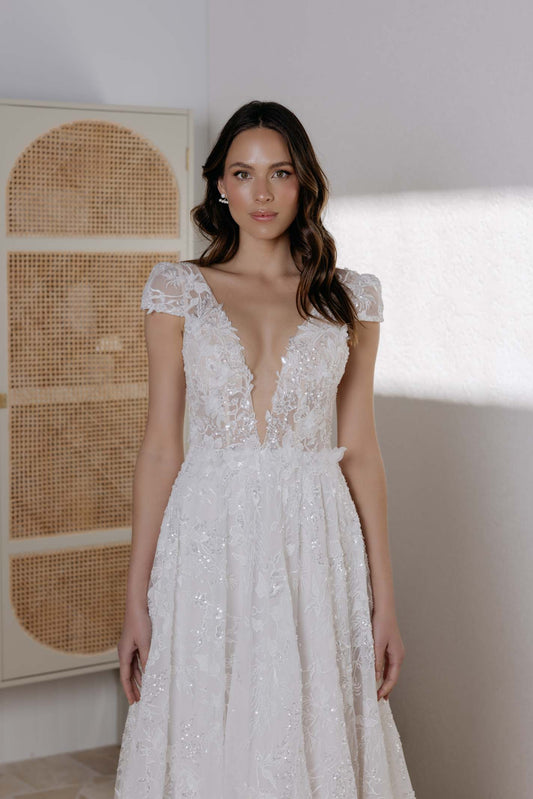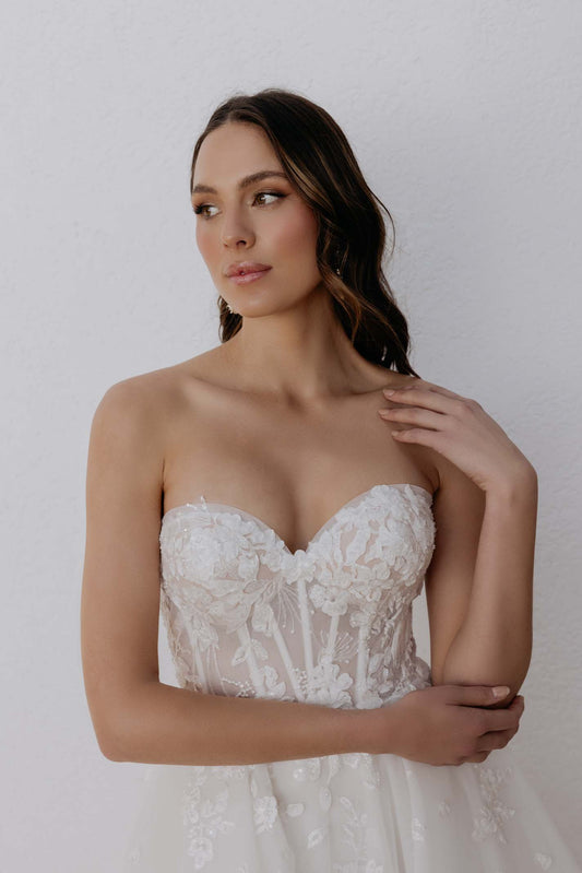 With twelve exclusive designs, Bliss splendidly showcases a range of stunning gowns including intricate lace detailing, captivating A-line designs, and graceful tulle creations.