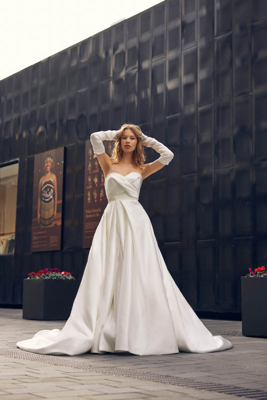 Introducing Lustre, our newest Atelier Wu collection which redefines modern romance with a bold, fashion-forward edge. Featuring sleek two-piece ensembles, artfully pleated chiffon, and dramatic, voluminous skirts, each design captures the essence of structure and softness within Bridal couture.