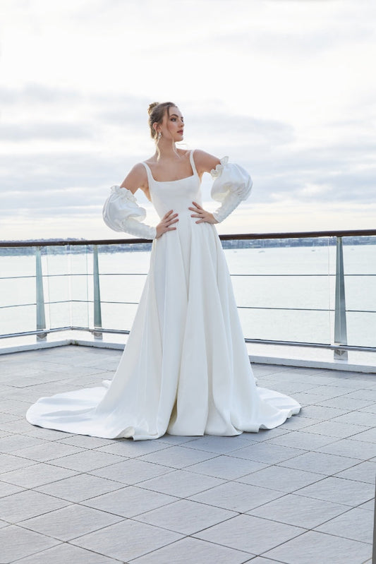 Featuring flattering sweetheart or plunging V-necklines that accentuate the waist, with romantic floating A-line silhouettes or figure embracing mermaid skirts, paired with sophisticated beaded lace or minimalistic crepes and satins, the Venus gowns cater to every bride’s desires.