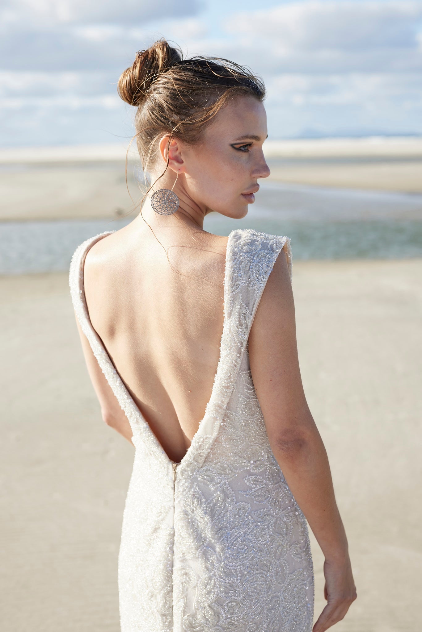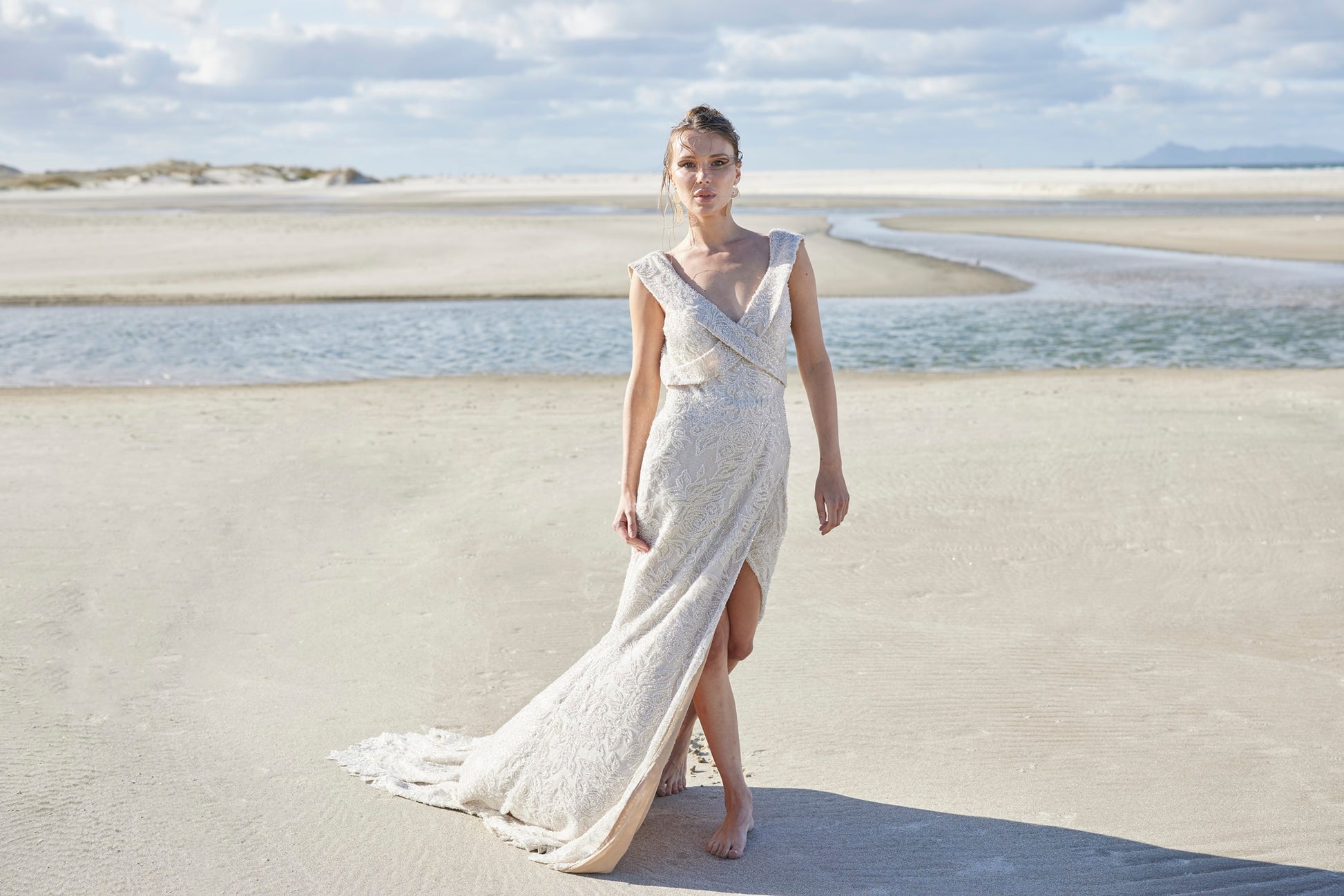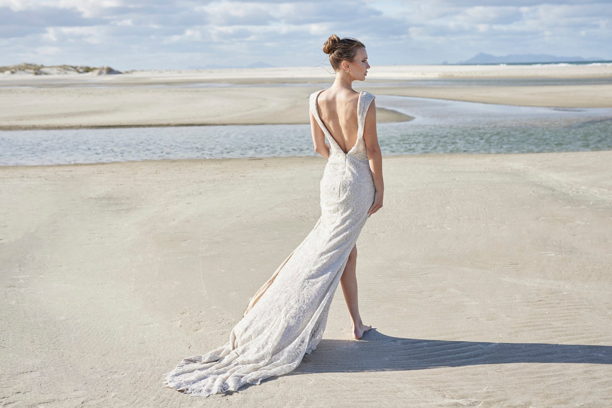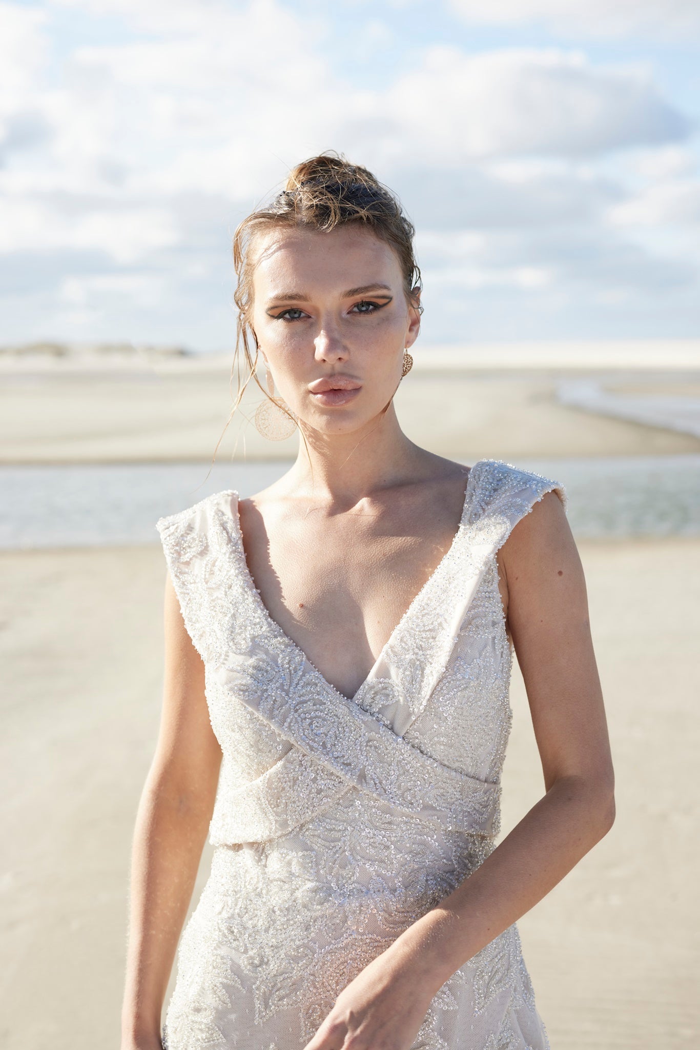Fashion-forward, bold and modern, Oksana is truly one of a kind. Her unique crossed bodice and deep v plunge back speak of a confident, daring bride.