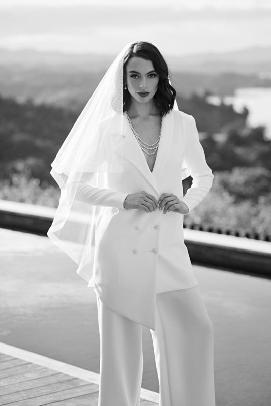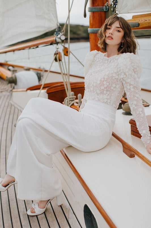 Not all brides want to wear a flowing white gown on their wedding day – enter the bridal white suit! Incorporating trousers and a usually sleeved top in one piece, a white suit is a unique and practical choice for many wedding occasions – whether it be the ceremony, elopement, bachelorette or as a reception outfit.