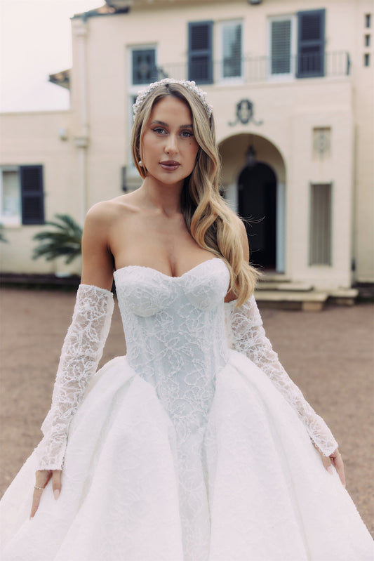 Introducing Lustre, our newest Atelier Wu collection which redefines modern romance with a bold, fashion-forward edge. Featuring sleek two-piece ensembles, artfully pleated chiffon, and dramatic, voluminous skirts, each design captures the essence of structure and softness within Bridal couture.