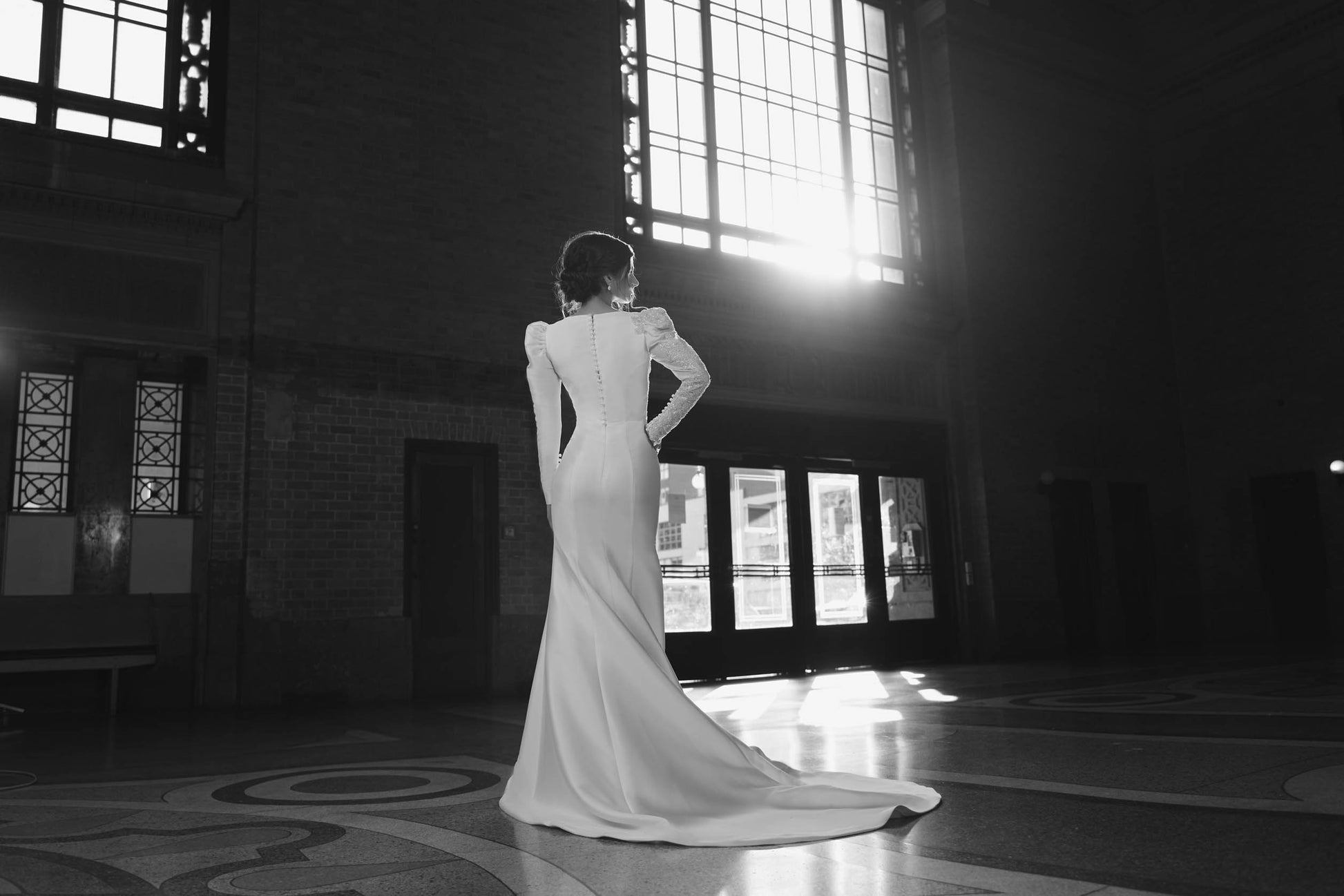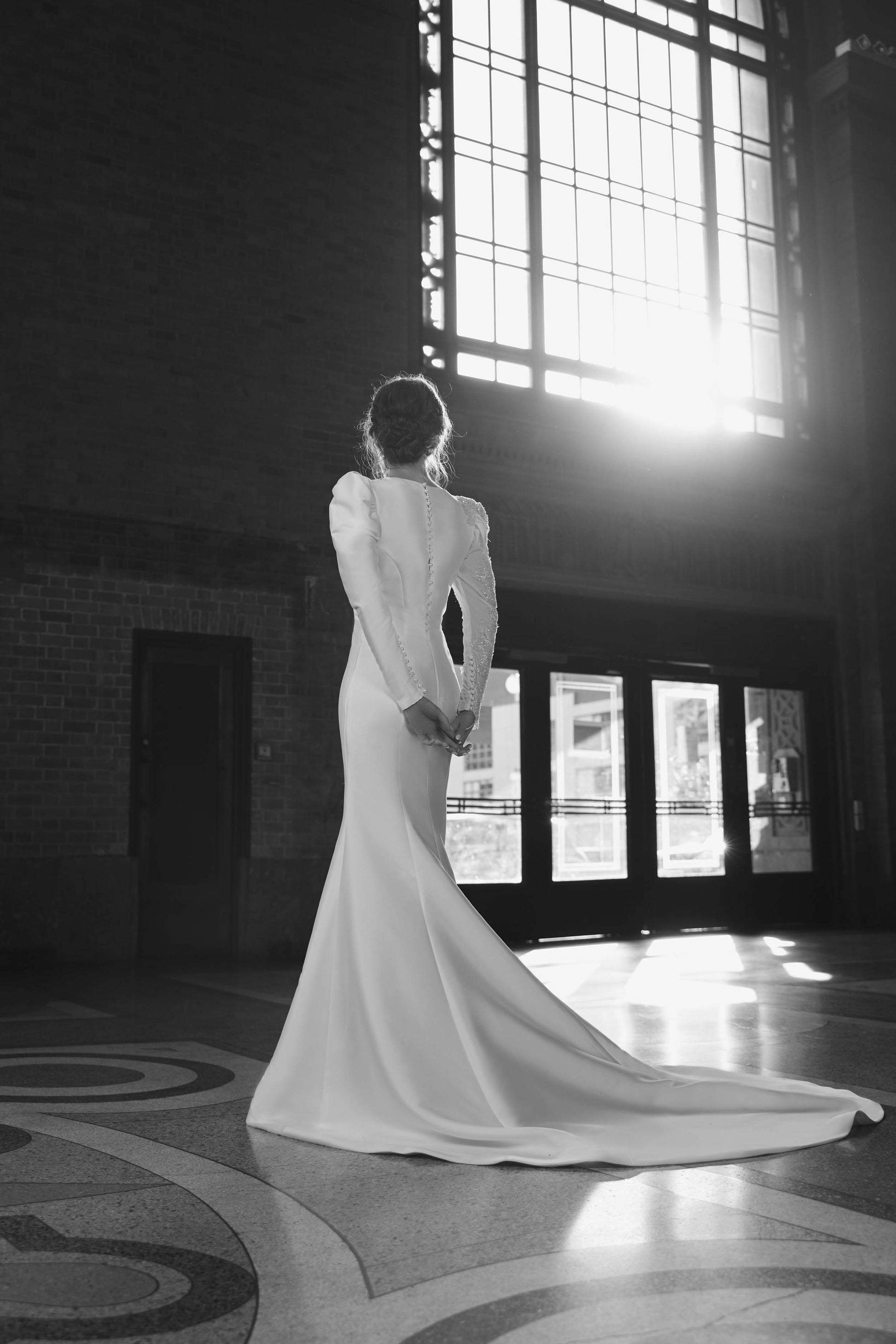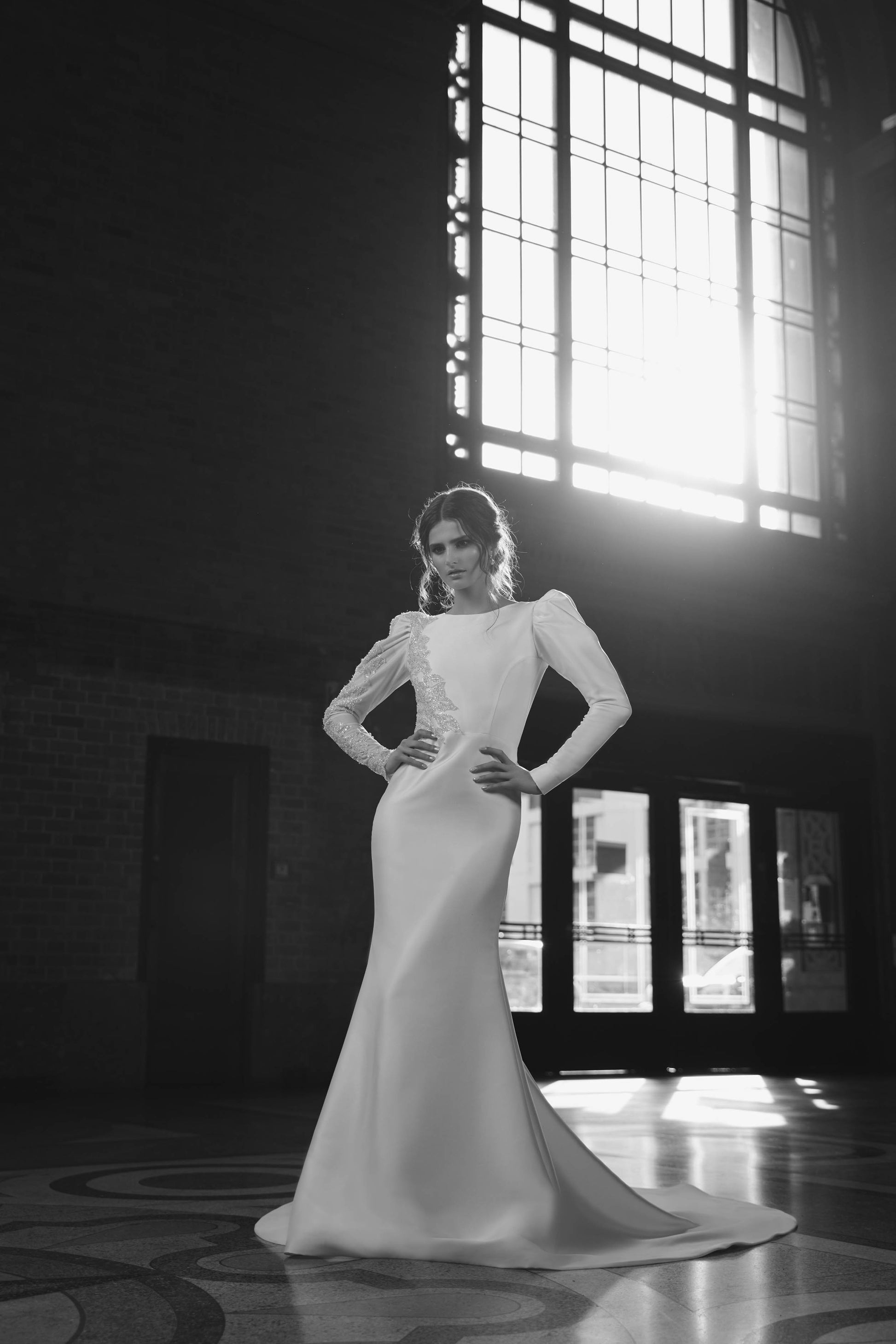 For the more reserved and modest bride, Sylvie is a great choice with her asymmetrically embroidered mutton sleeves and jewel neckline, providing both style and coverage.