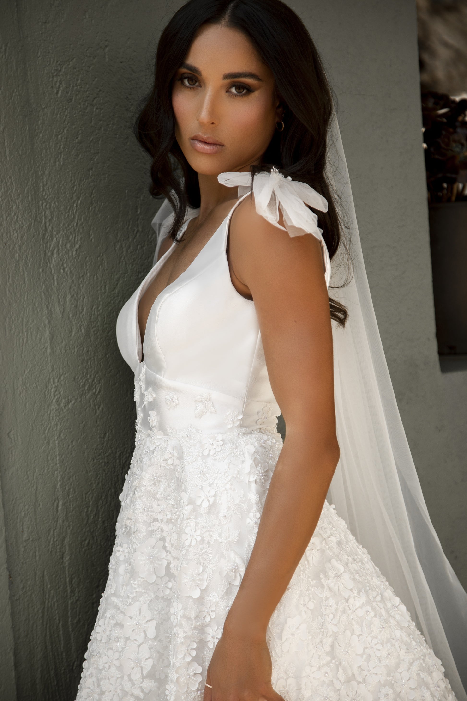 This A-line mini is crafted from soft satin and adorned with delicate 3D floral lace, adding a touch of romance and charm.