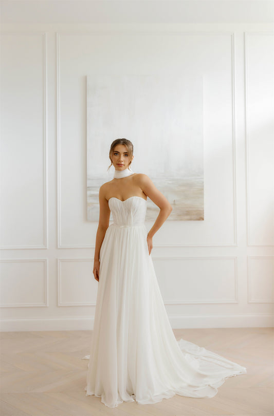 Introducing Lustre, our newest Atelier Wu collection which redefines modern romance with a bold, fashion-forward edge. Featuring sleek two-piece ensembles, artfully pleated chiffon, and dramatic, voluminous skirts, each design captures the essence of structure and softness within Bridal couture.