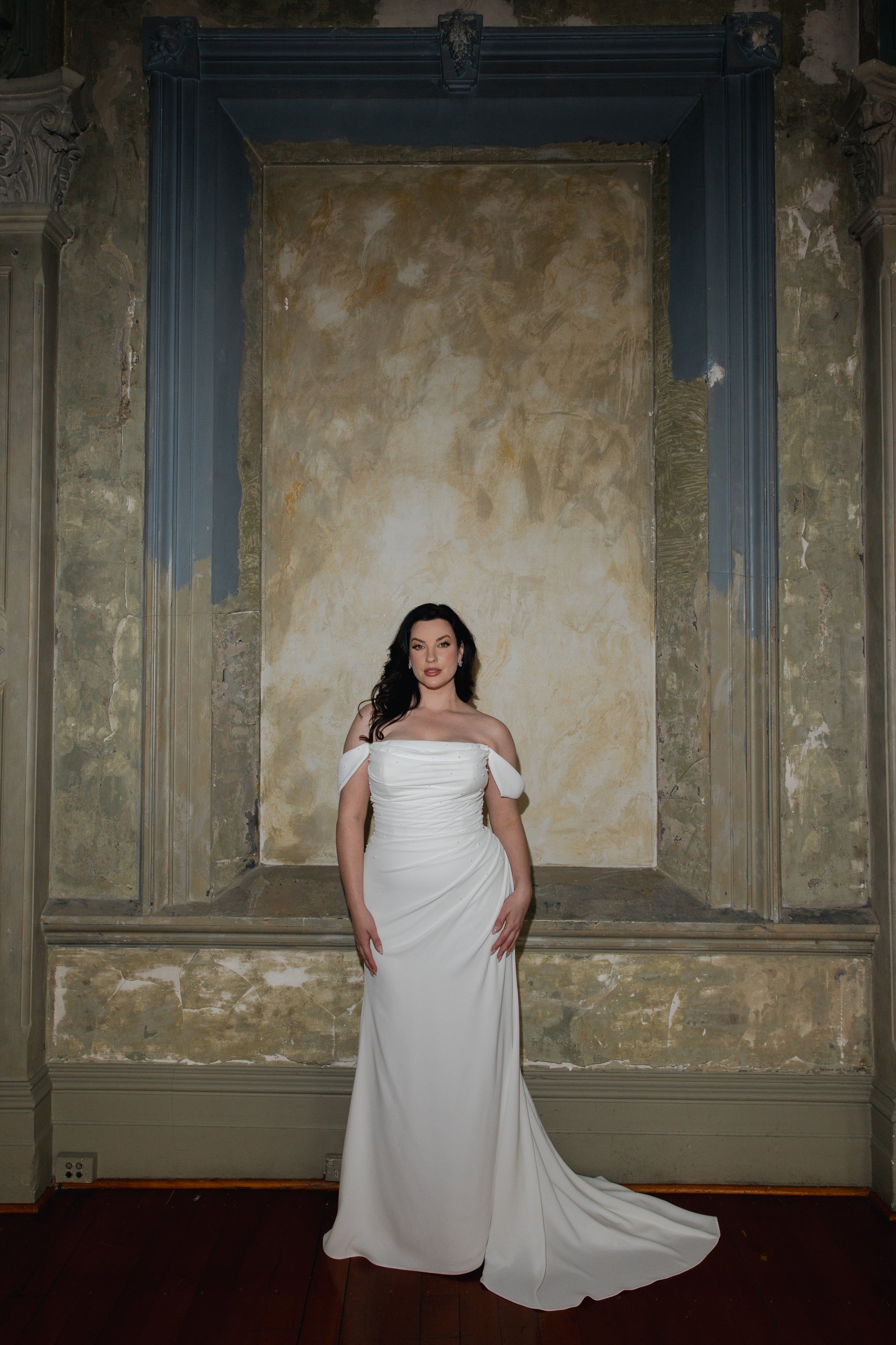 April features the same timeless elegance with the added touch of beautiful pearls. For added versatility, April comes with detachable draped off-the-shoulder sleeves, allowing you to customize your look for any moment of your special day.