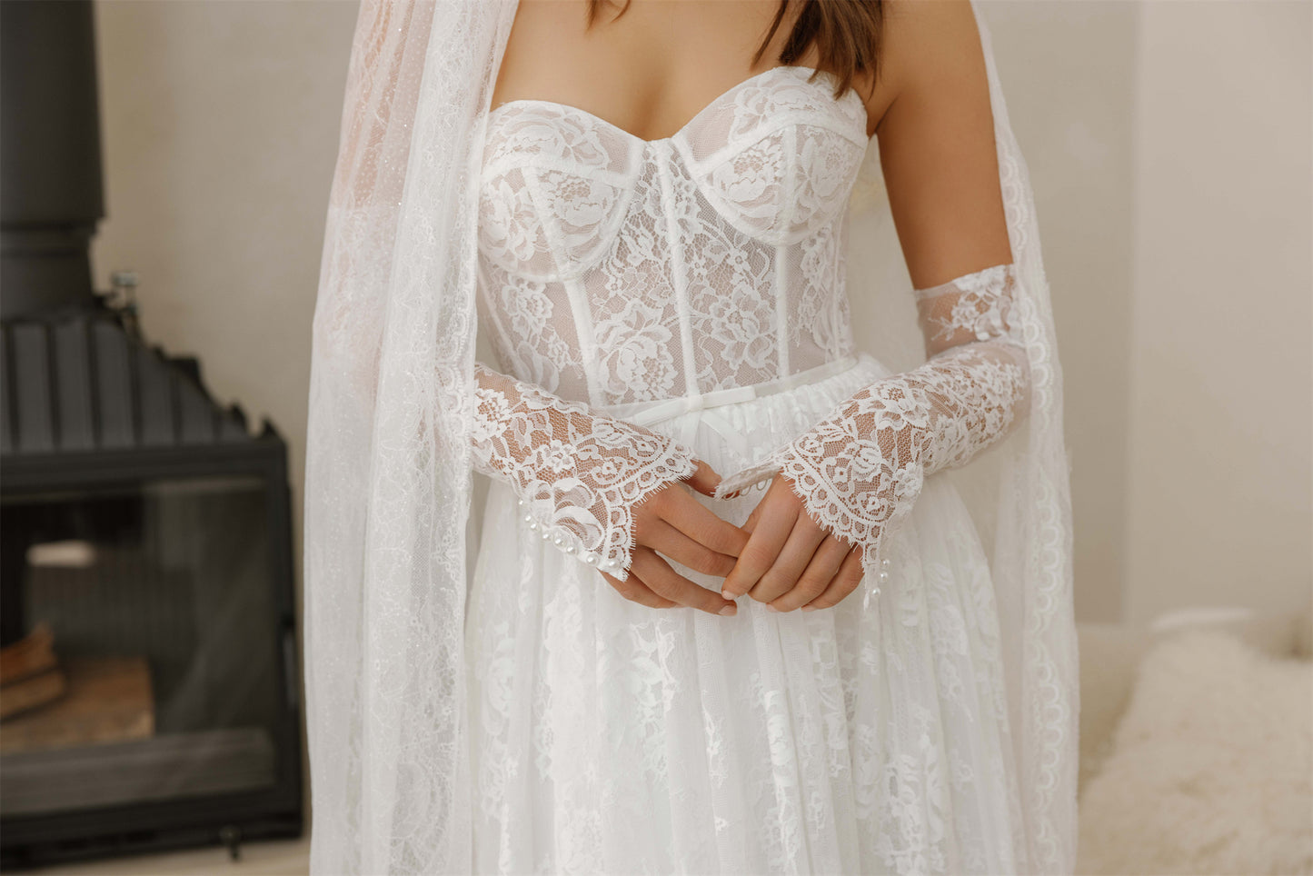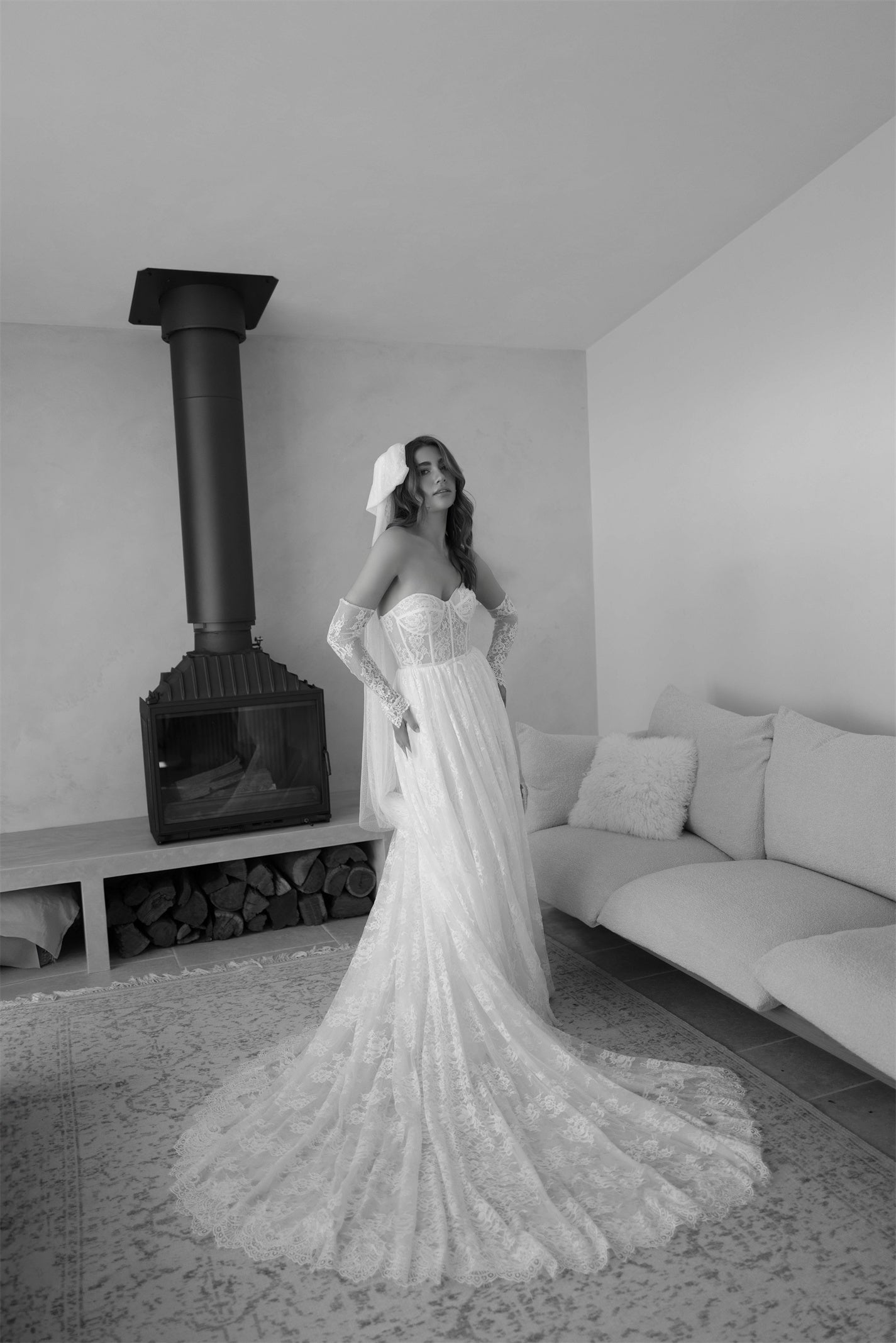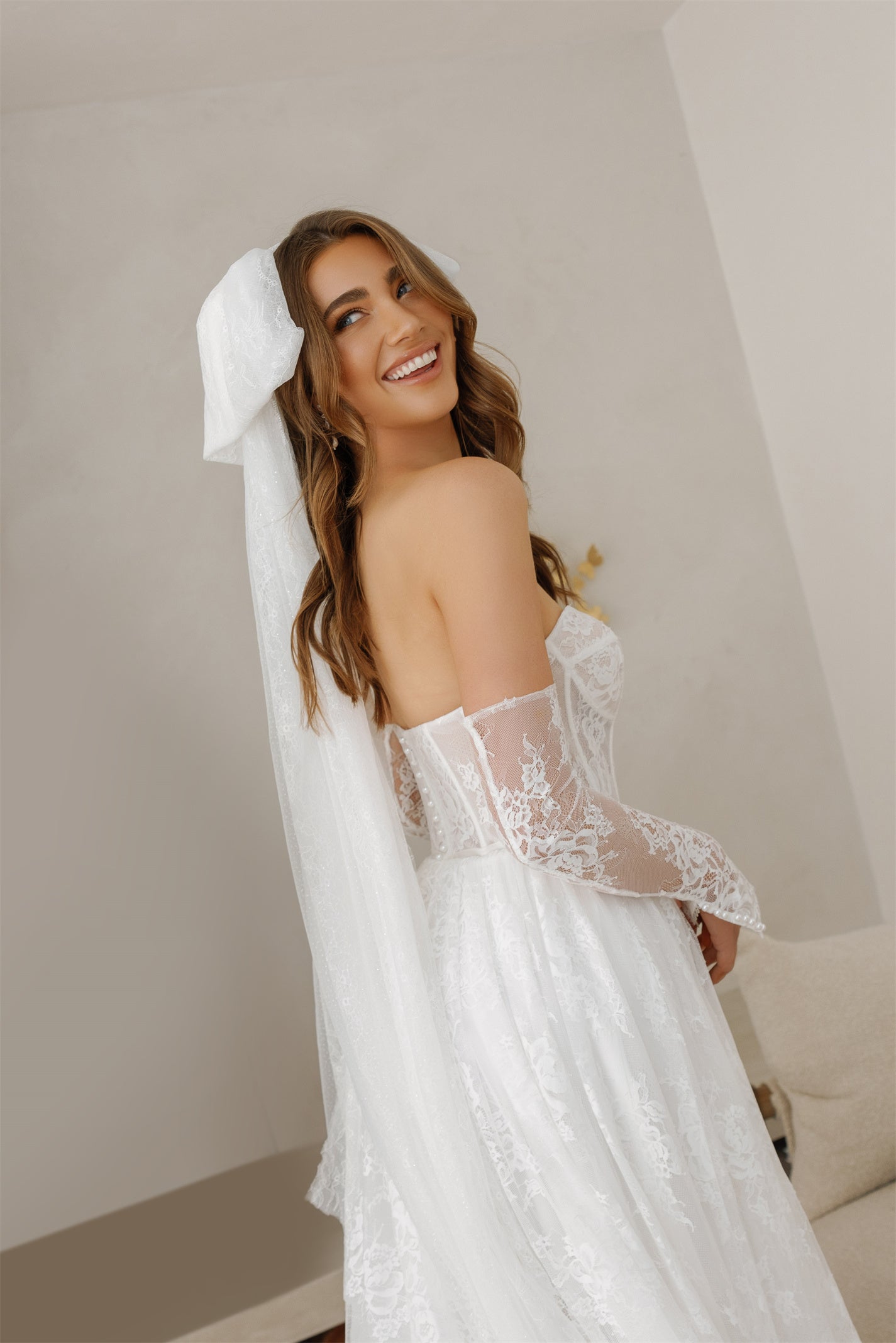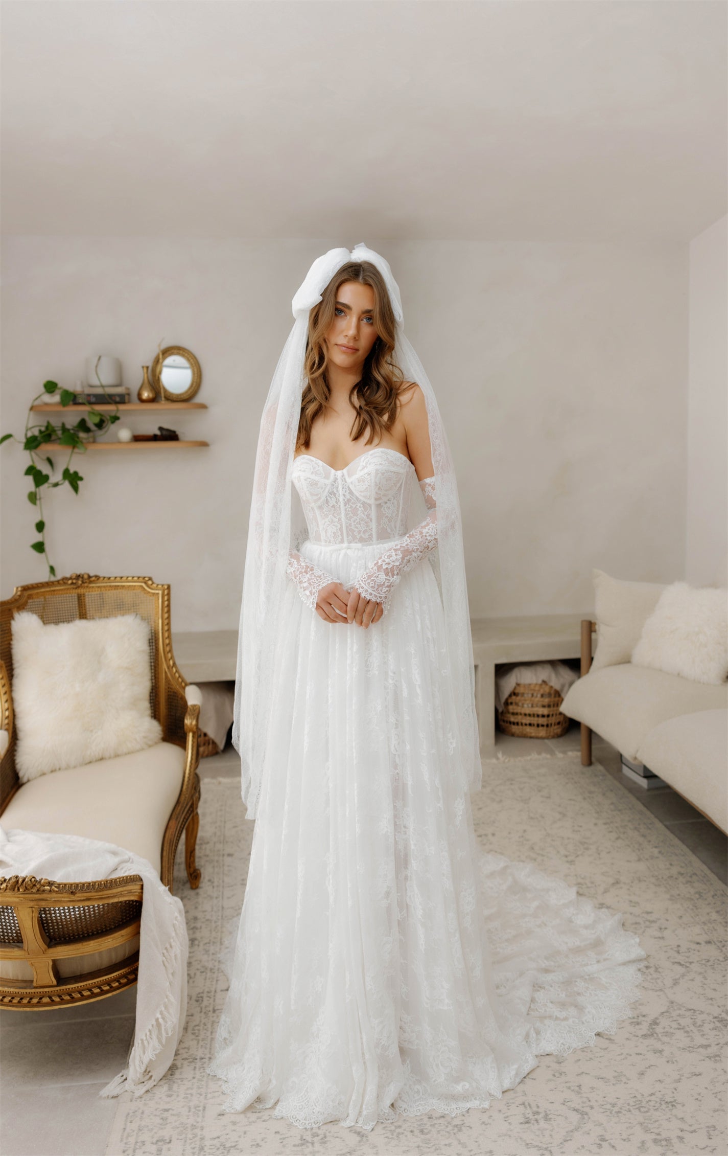 Nothing says whimsical, care-free and bohemian quite like Kate. Covered entirely in chantilly lace, this gorgeous A-line gown falls and drapes onto the floor in the most elegant way. Finishing the look are a pair of tight fitting lace sleeves which complete the vision, adding a certain sweetness.