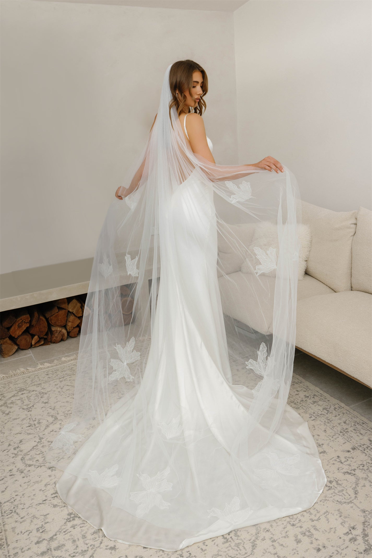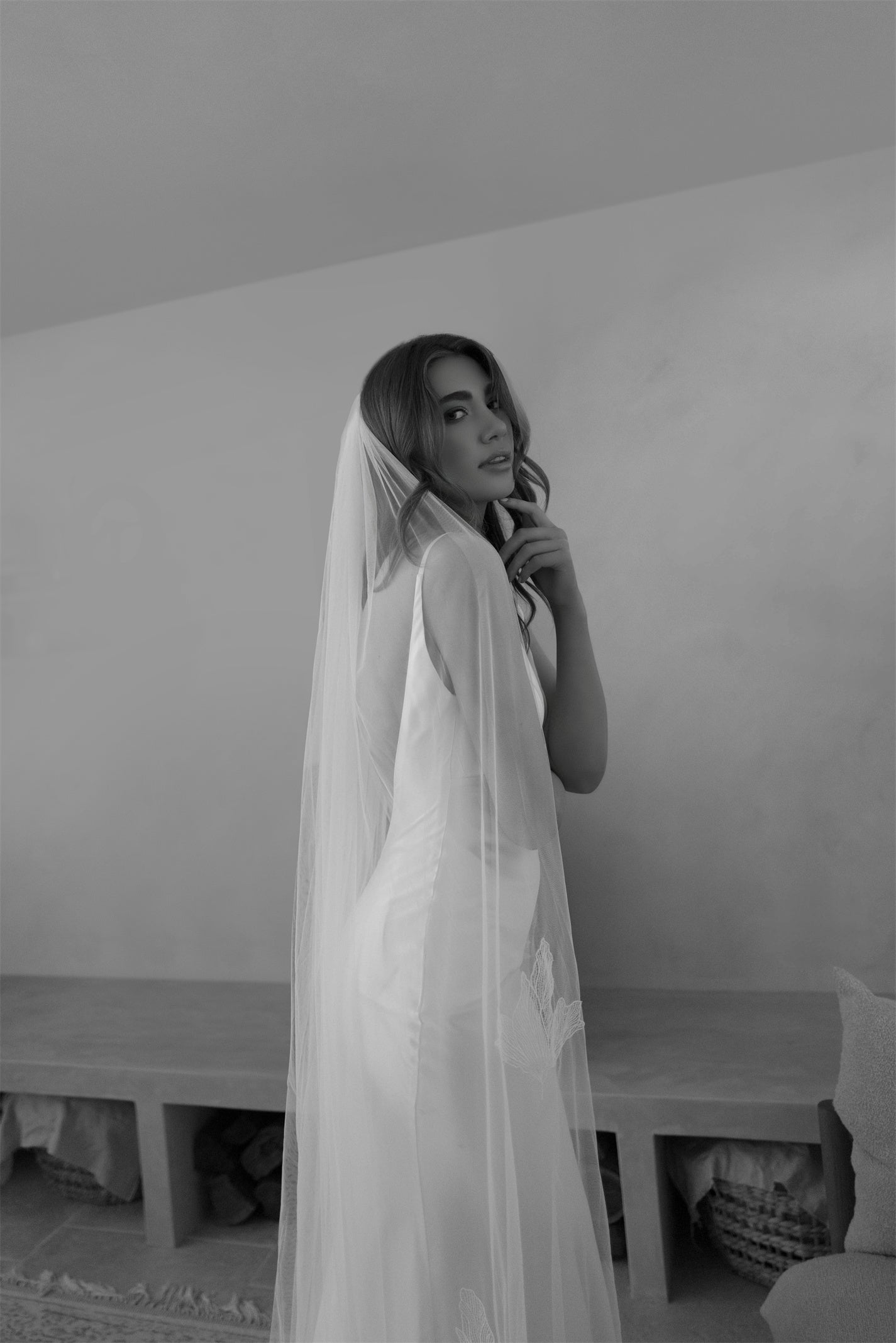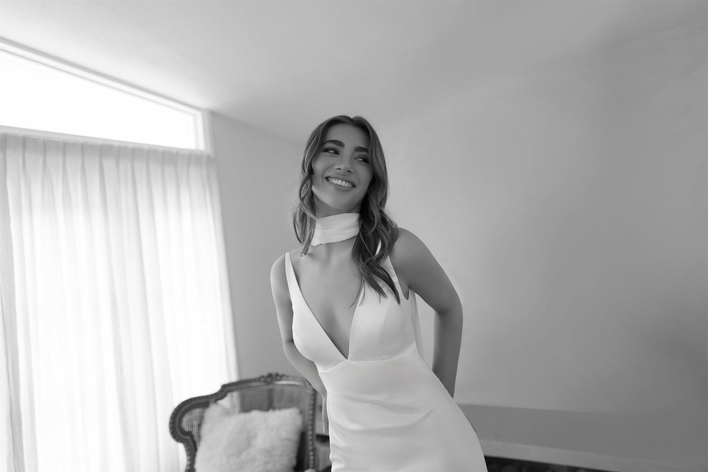 A classic take on the timeless evening gown, Miya's alluring V-neck plunge flatters the decolletage, a perfect choice for the sensual minimal bride. Classy and timeless, her sheath fit and chapel train elevates the look, adding elegance.