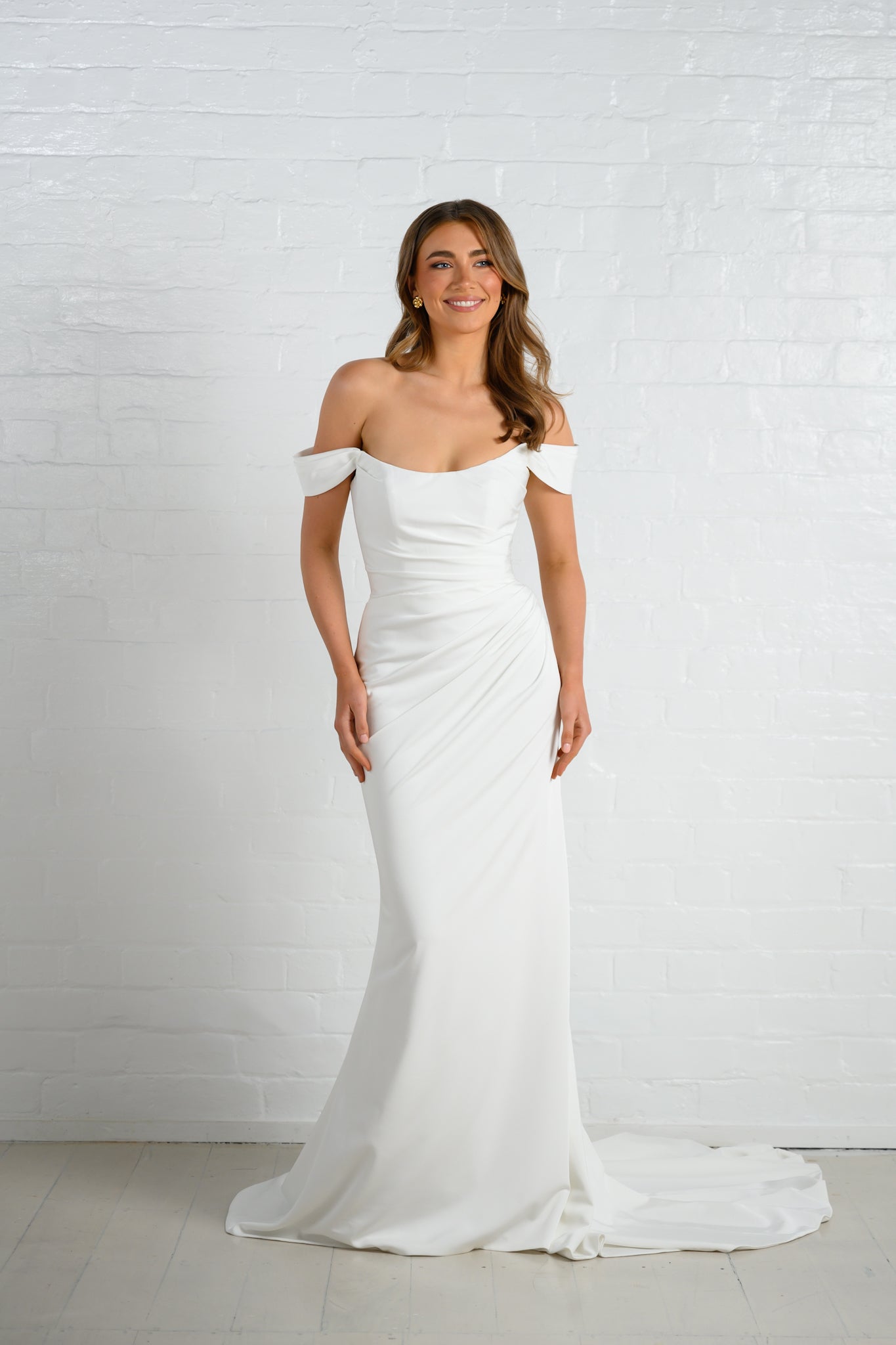 Her pleated bodice and Cat-Eye bust bring a minimal but effective Bridal style, paired with the classic off-shoulder cap sleeves.