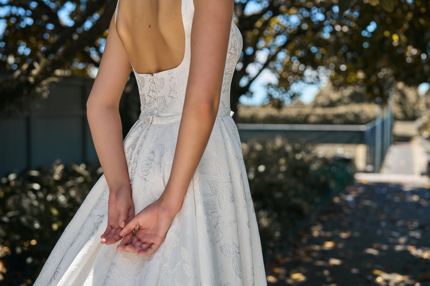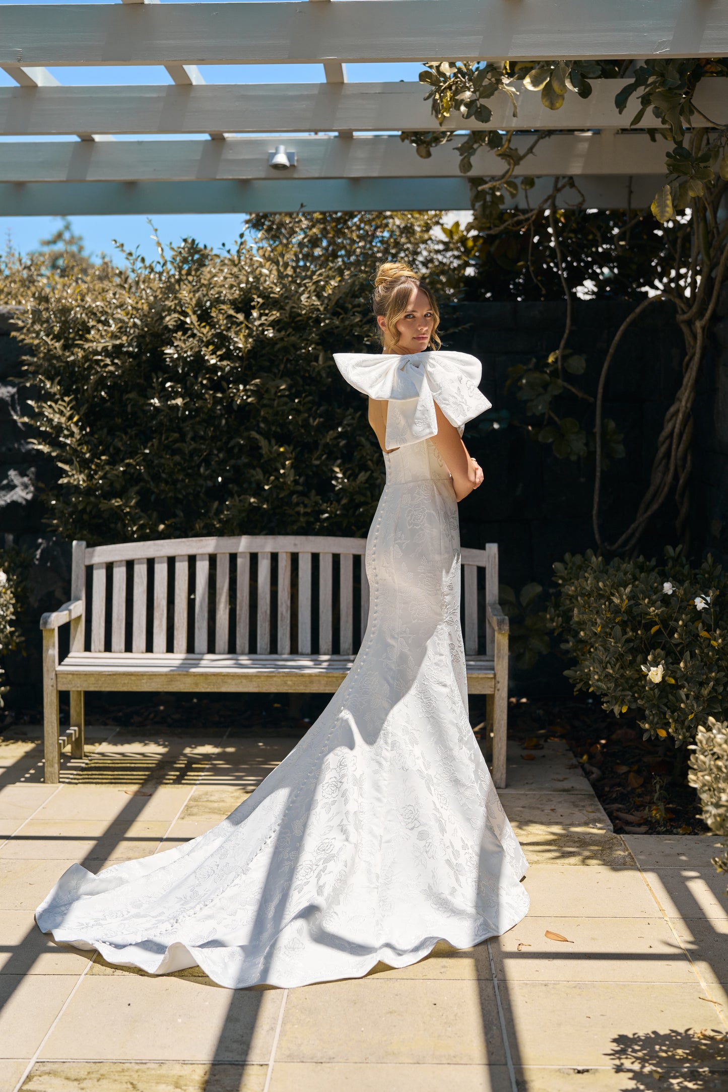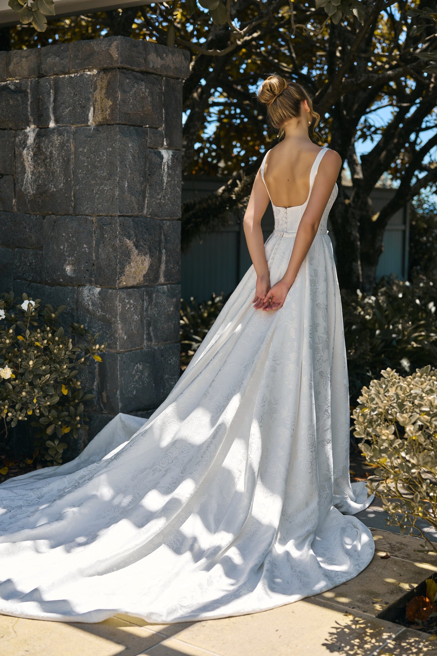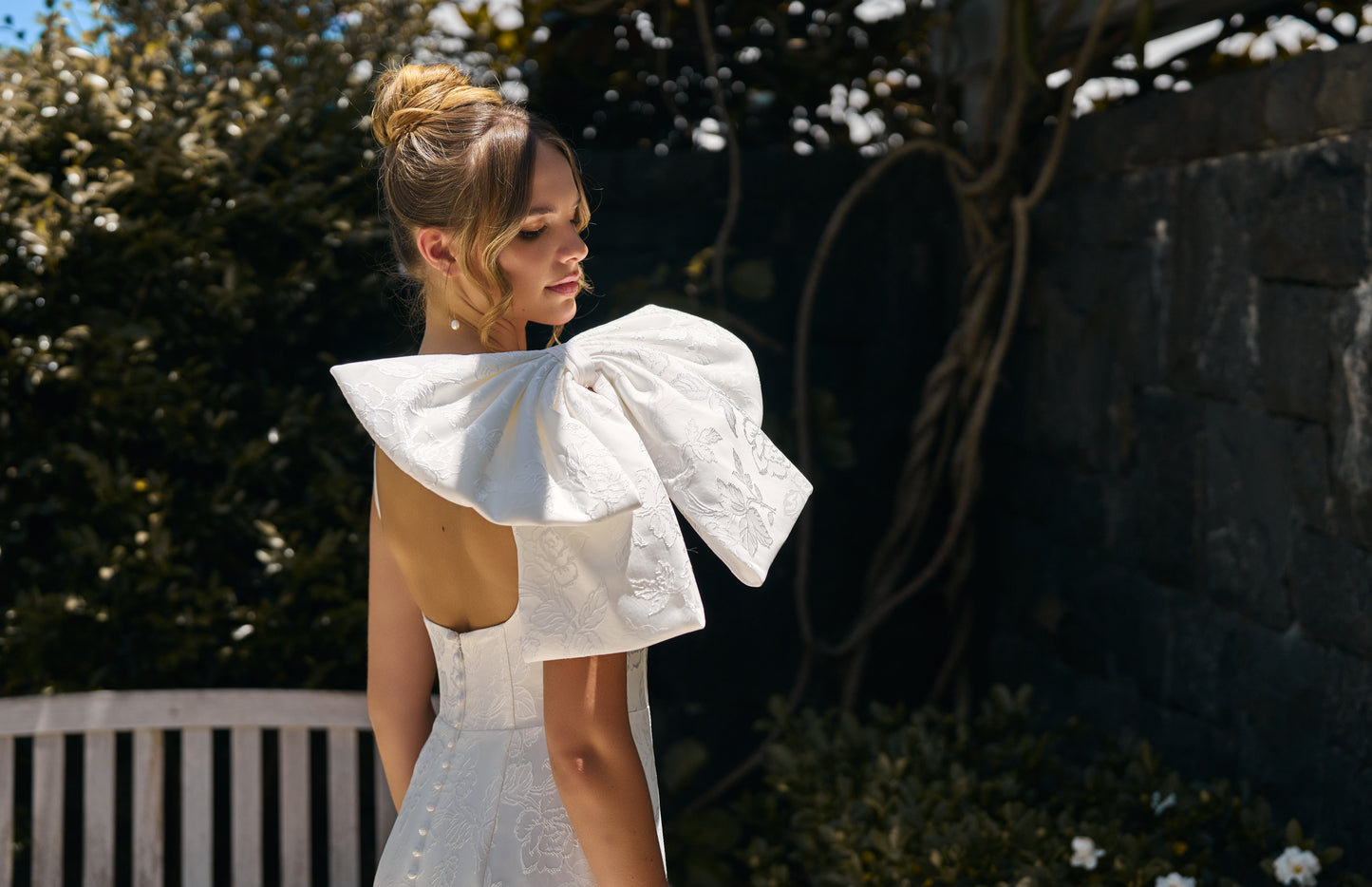 Crafted with floral organza fabric, Perry is not a dress you will come across often. Featuring a square neckline and a fitted bodice with boning detailing. The skirt is fitted at the waist accentuating your curves. The dress features a statement bow, belt and overskirt which are all detachable making the dress versatile. From simple to dramatic this dress will give different looks throughout your wedding day.
