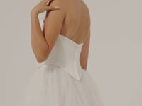 Paired with a voluminous A-line skirt crafted from tulle, the gown floats effortlessly.