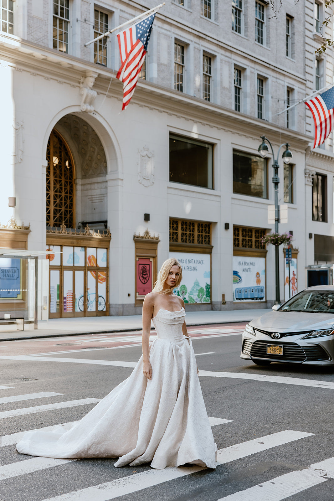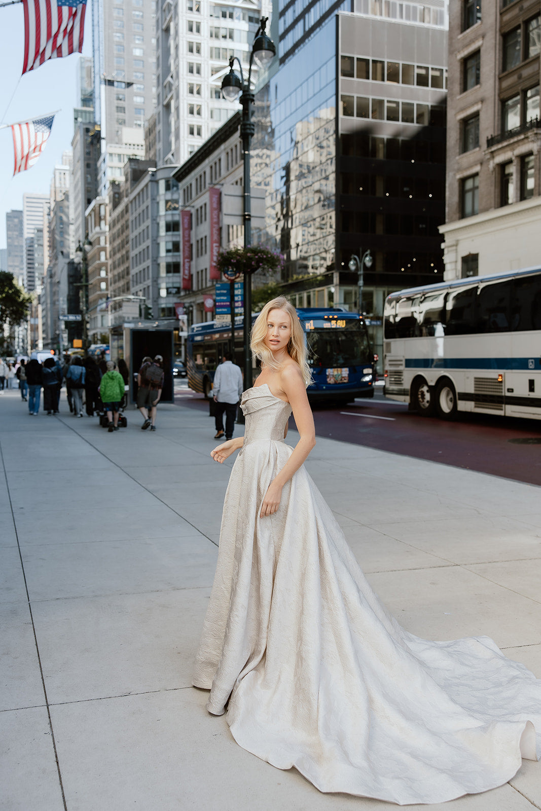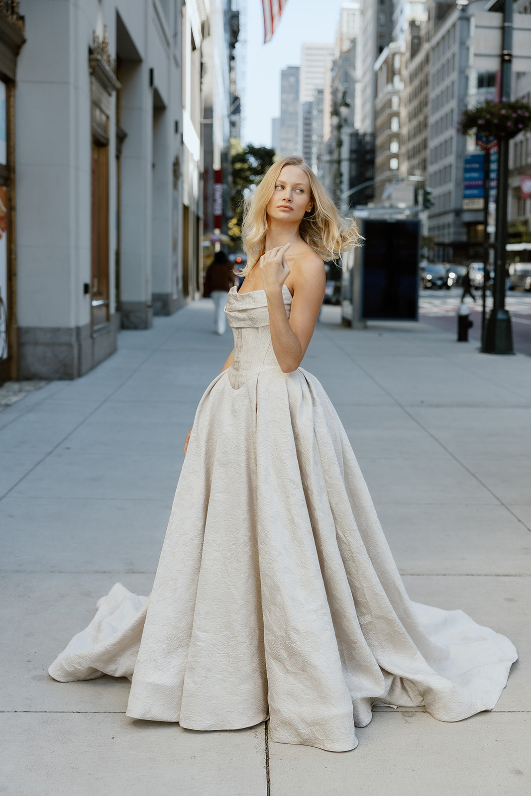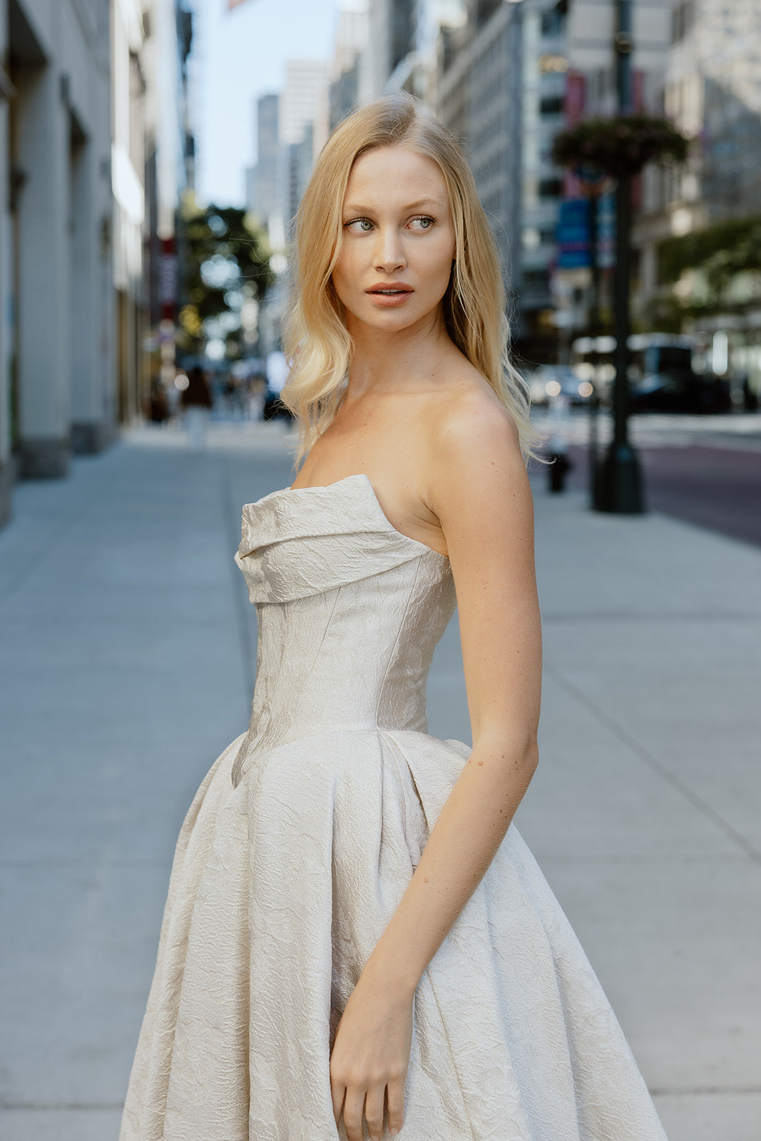 Draped in shimmering light gold fabric, Charlotte is as regal as she is feminine. With the ruching around the cat-eye bust and full, dramatic ballgown skirt. Charlotte effortlessly captivates the attention of everyone in the room.