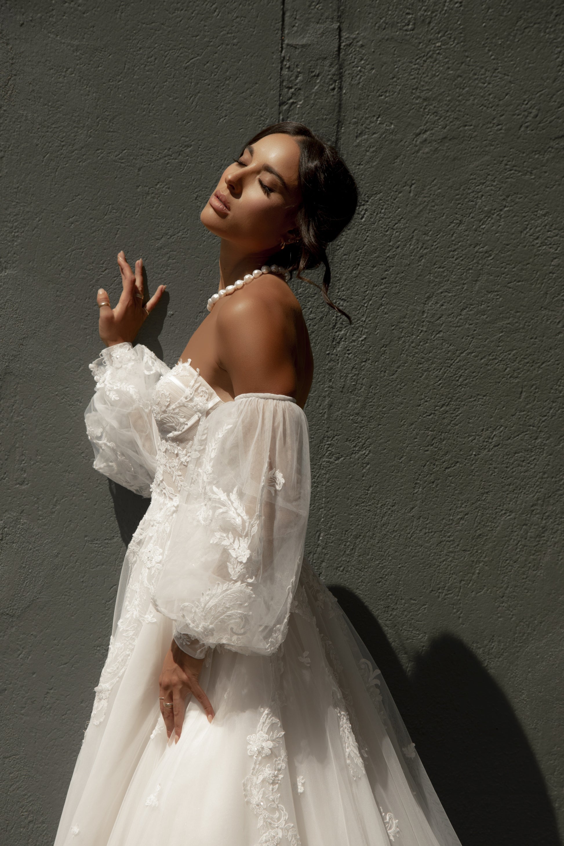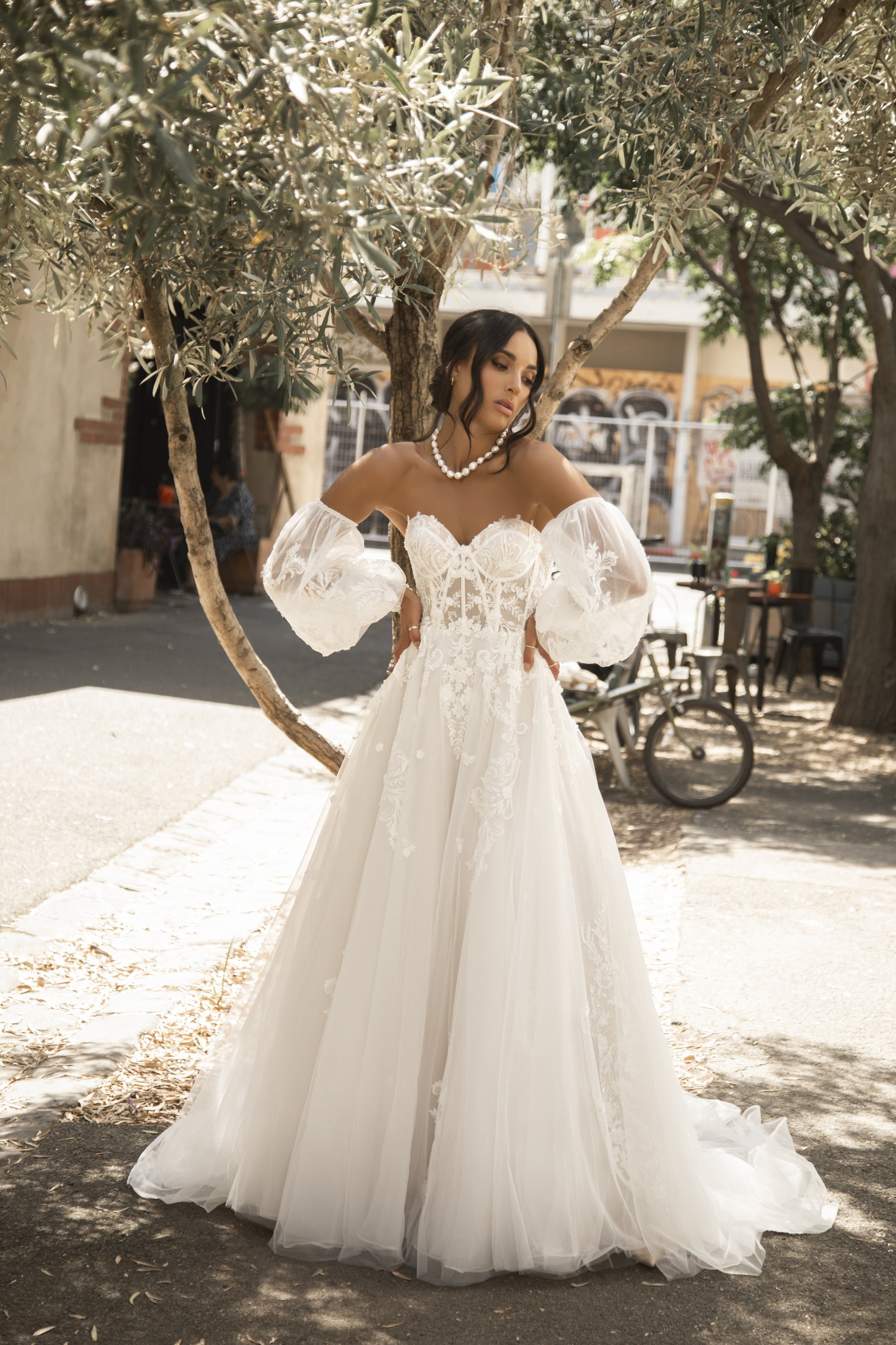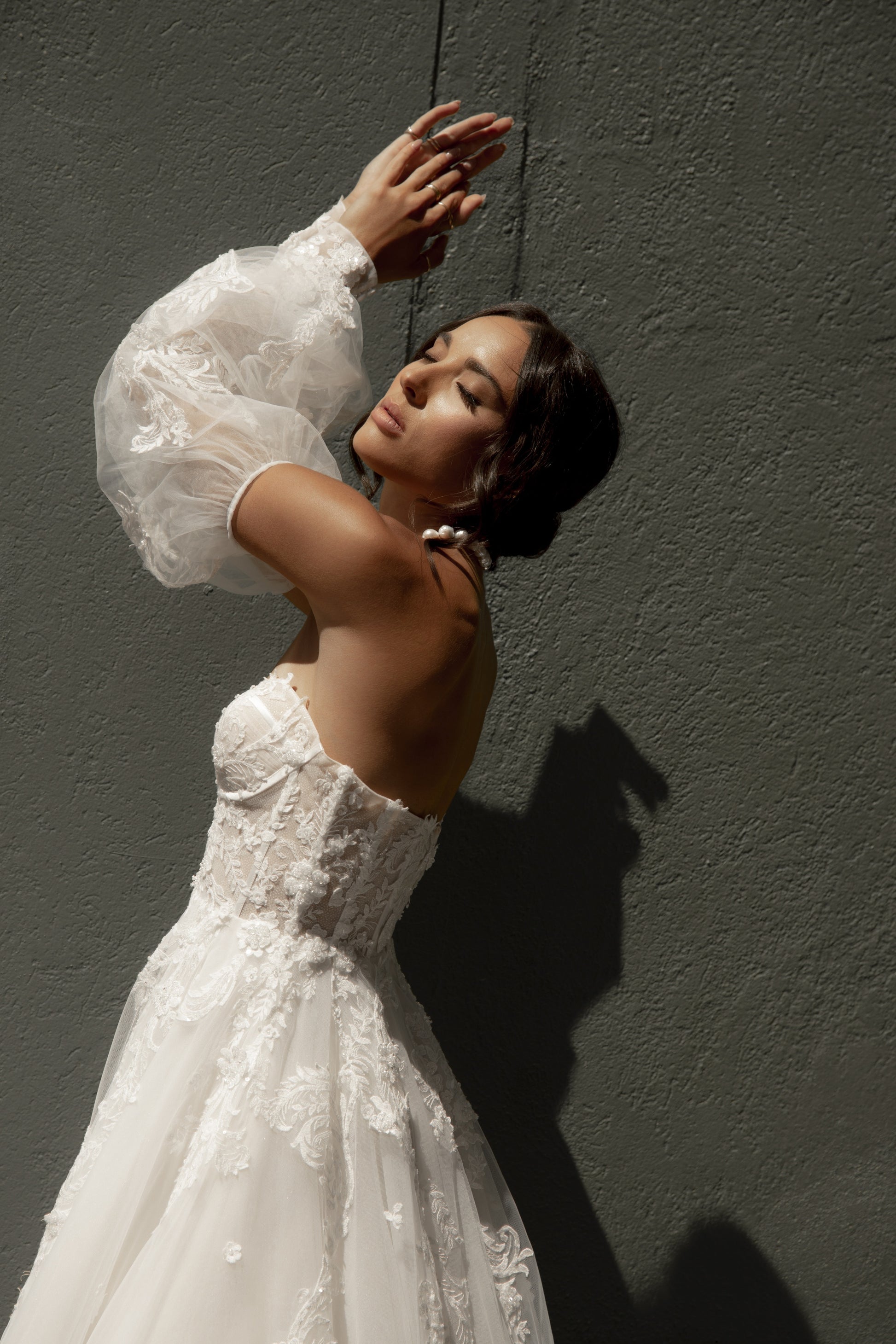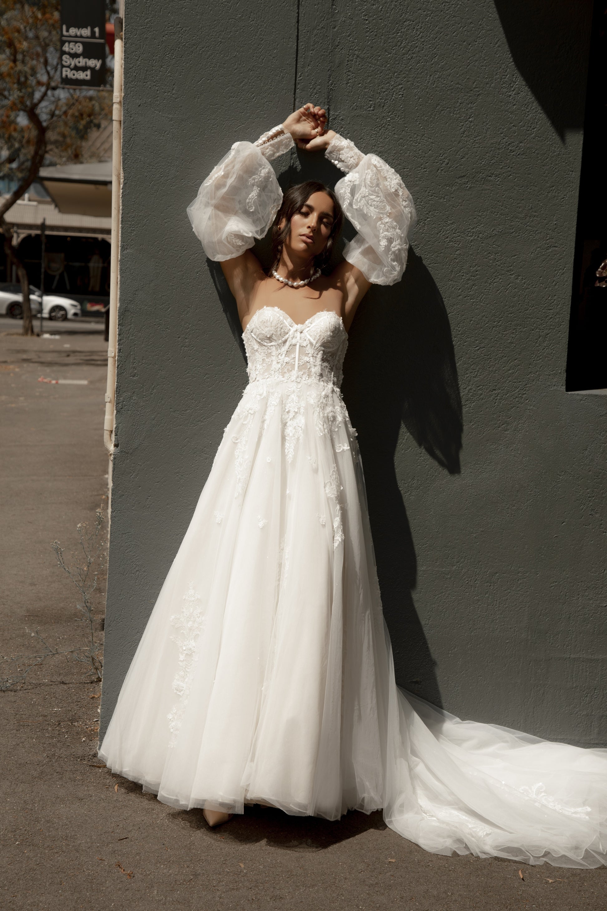 Our Rhoda gown is the perfect designer gown that will make you look and feel like a princess. She features a strapless neckline and structured bodice which accentuates the waist. Rhoda is crafted with floral lace which cascades down the bustier and flows into the tulle A-line skirt. The detachable bubble sleeves bring versatility to the gown, allowing an optional romantic touch.