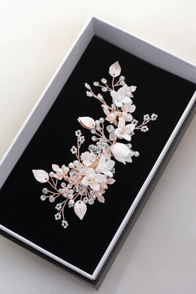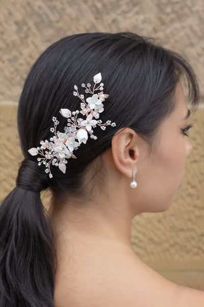 With all the intricacies of a growing vine and the softness of a petal, let Harlow grow along the back of the head. With feather-like qualities, Harlow gently weaves itself with elegance and glamour. Fitted with a strong clip at the back, Harlow is easy to rest over the top of a veil and wear all night long.