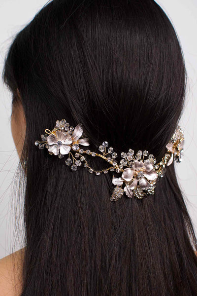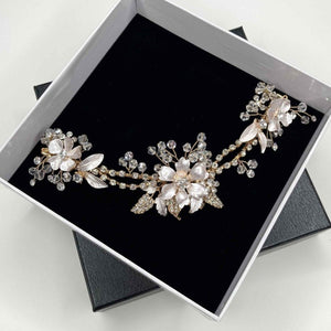 Astor is a beautiful floral short vine encrusted with small crystals and springs of crystal beads. This short vine is perfect to drape over bun hairstyles and at the back of bridal veils.
