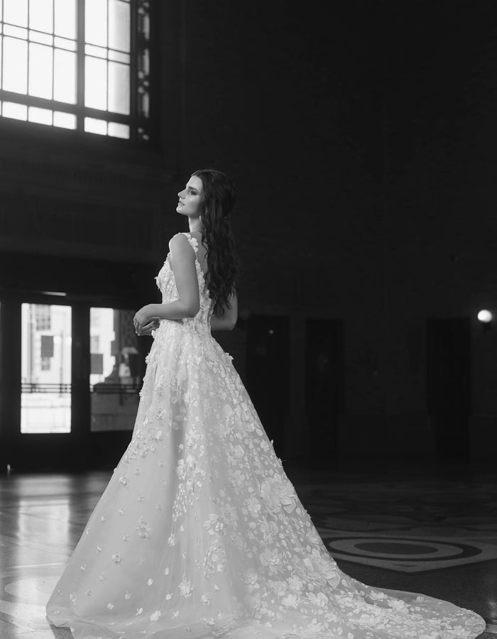 Look no further than our Abi gown if you're seeking a whimsical and captivating dress for your momentous day. Embellished with an intricate floral bodice that presents a sweetheart neckline, complemented by a feather-light A-line tulle skirt. Abi also unveils a train adorned with three-dimensional lace flowers, adding an extra touch of romanticism and beauty.