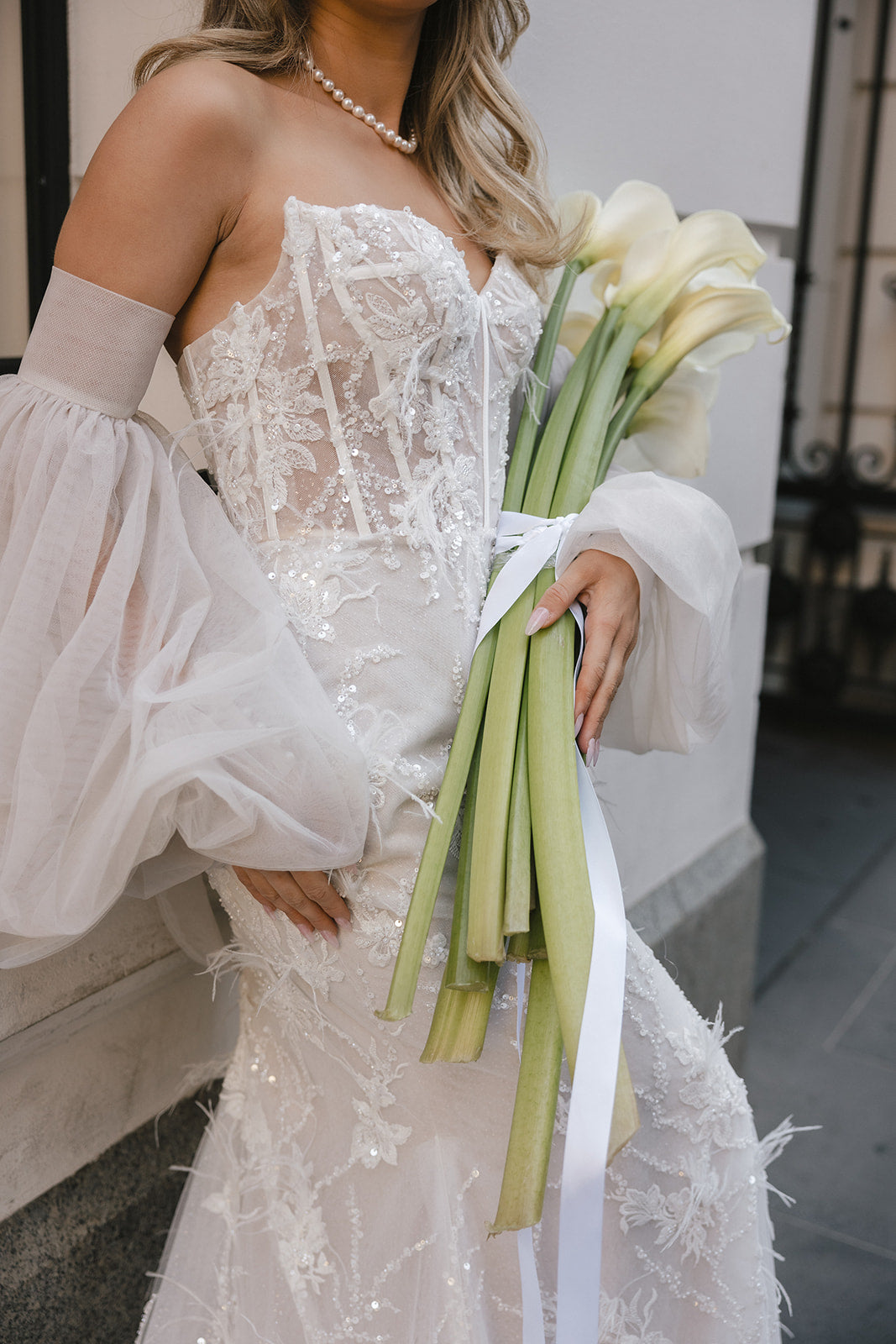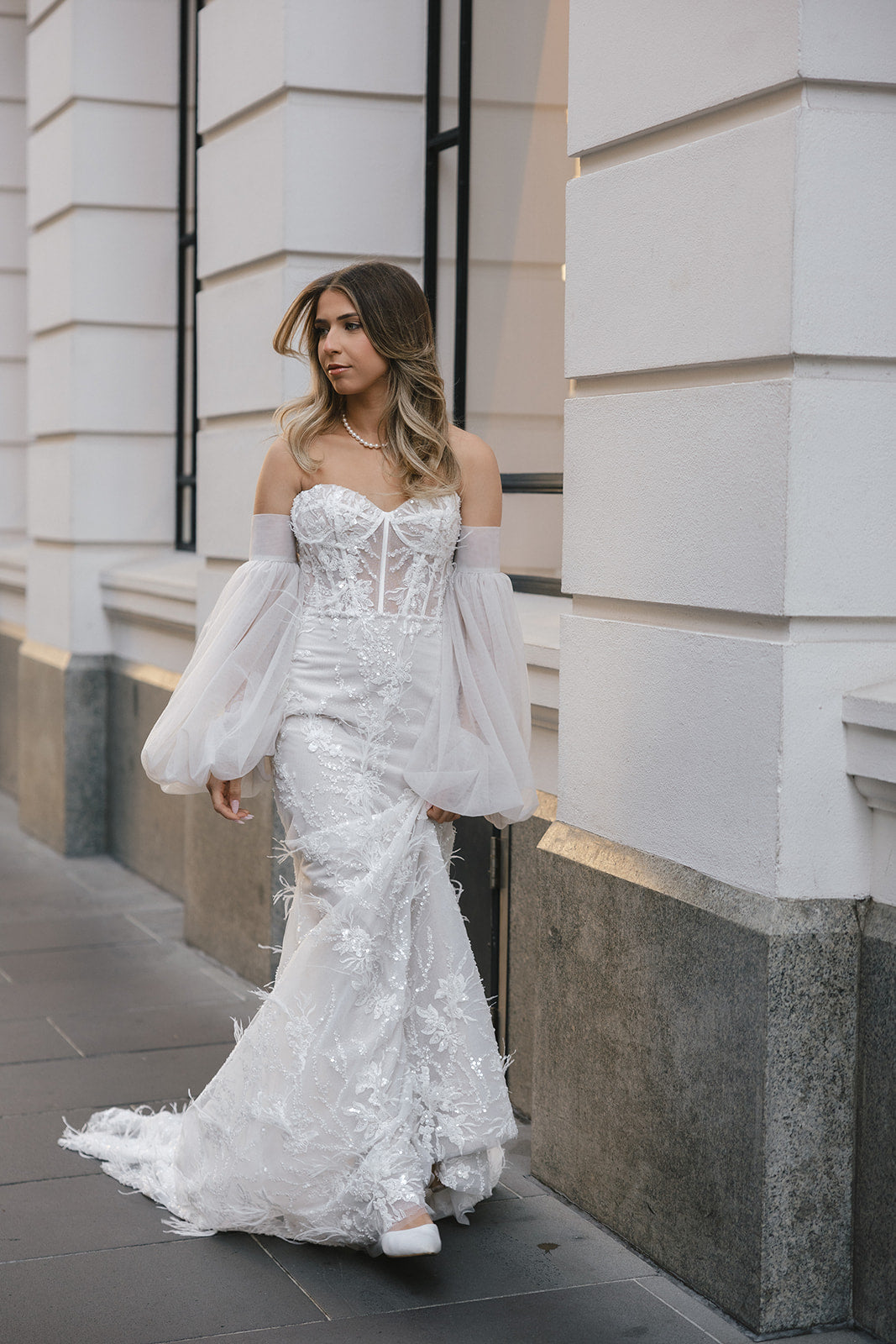 Introducing our latest masterpiece, Asher is adorned with beautiful feathers and shimmery Beaded lace. The gown features a sheer sweetheart bodice with added curves at the corners to give the chest a fuller look, flowing down into a fit-and-flare skirt. Add the detachable sleeves for a completely different look, or keep it strapless for timeless elegance.