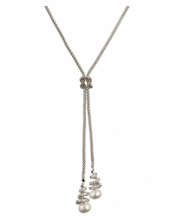 Our Athena Pearl Necklace is a modern take on a classic pearl necklace, brought together with a knot and set in cubic zirconia encrusted spirals, this piece is sure to dazzle.