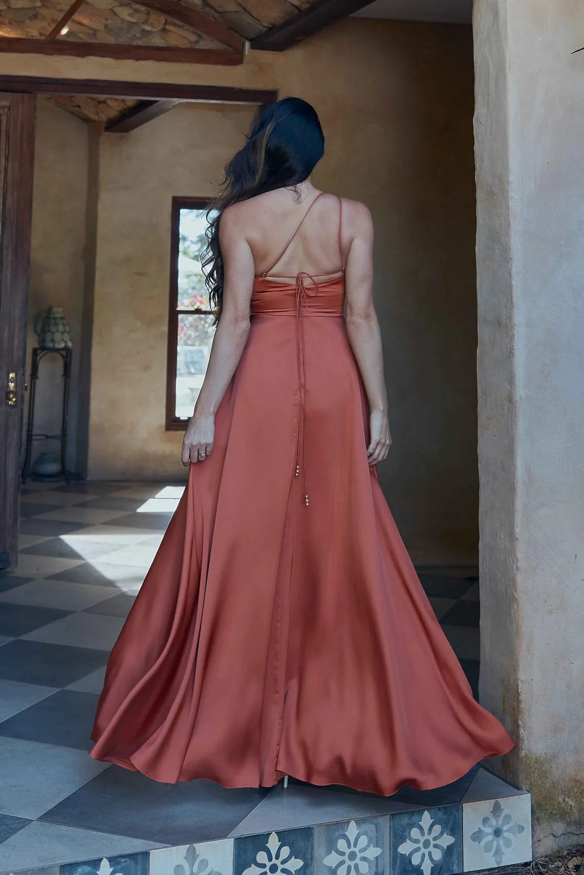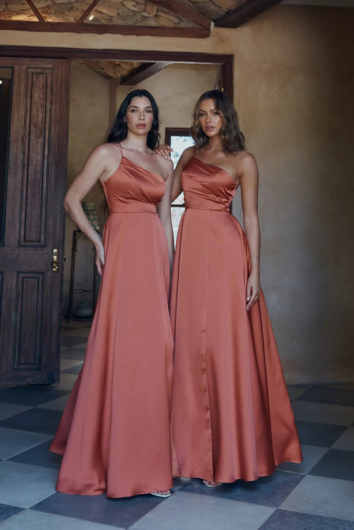 The Carina TO2326 dresses are crafted from the luxurious main fabric of light satin, which exudes elegance and sophistication. The one-shoulder bodice showcases exquisite pleating details, adding texture and dimension to the dress. The spaghetti straps open at the back and feature a captivating lace-up tie, adorned with a tassel gold jewelled detail. This unique and eye-catching element adds a touch of glamour and charm, making your bridesmaids shine like stars on your special day.