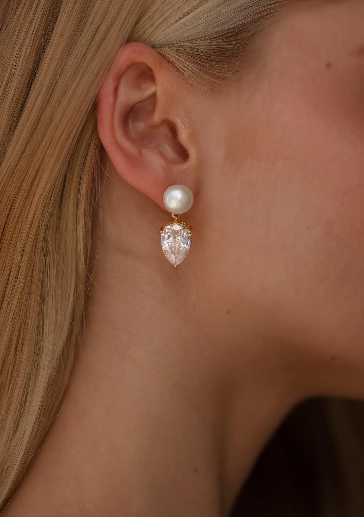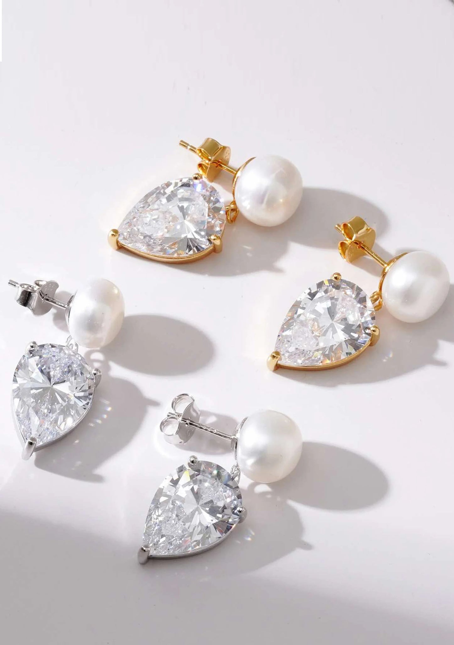 The Harper earrings are a modern take on the traditional pearl drop wedding earring. They feature round freshwater pearls and pear cubic zirconia stones suspended in a claw setting.