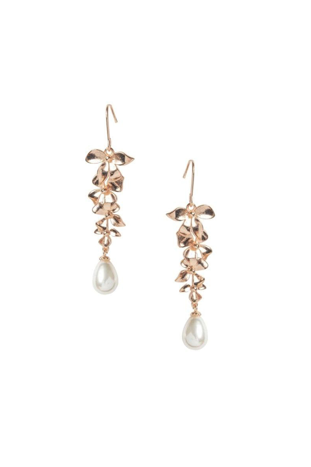 Stylish orchid style chandelier drop earrings - embellished with rose gold metallic orchid shaped petals with an ivory simulated pearl drop on a rose gold finish. Approx 6cm long