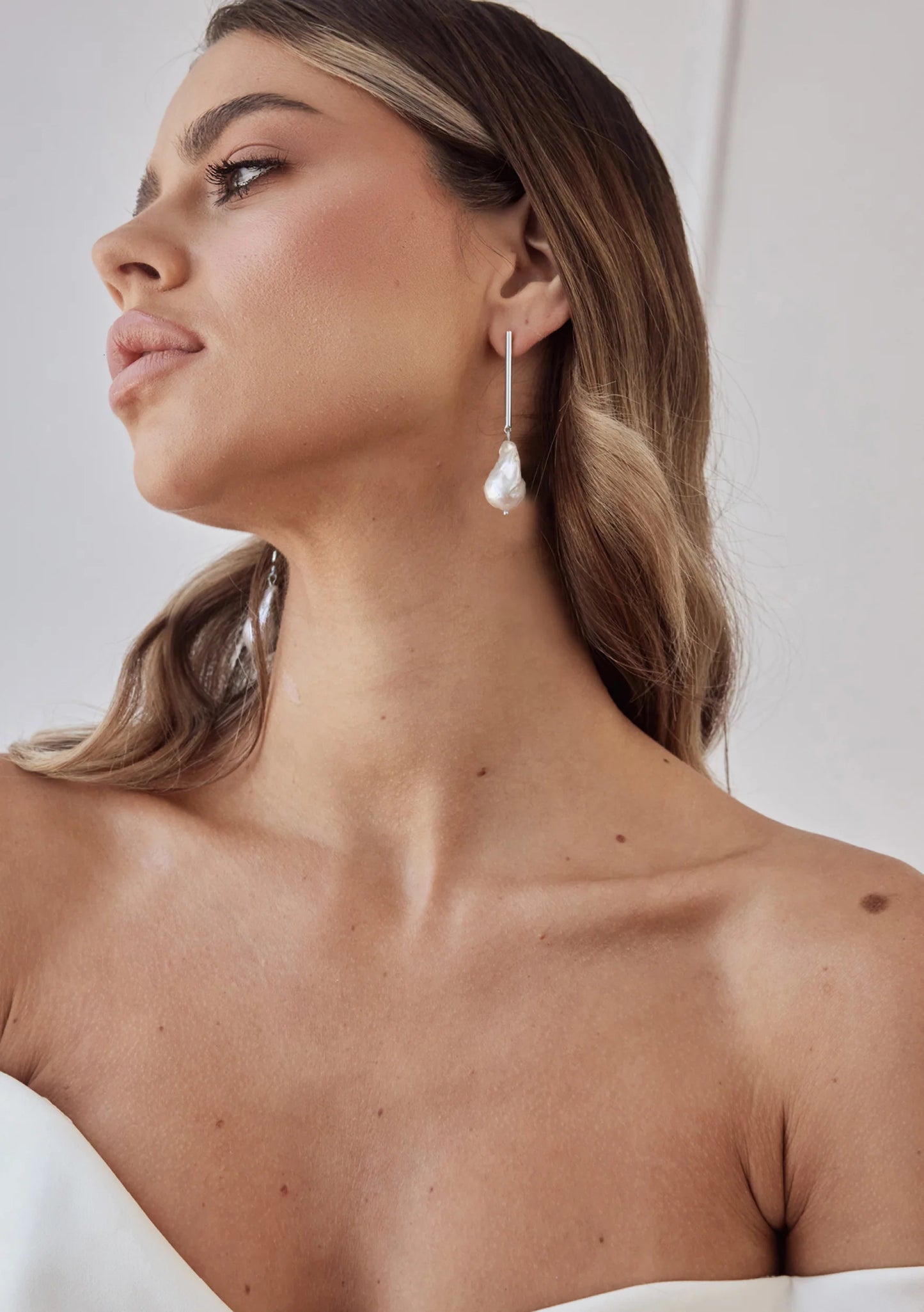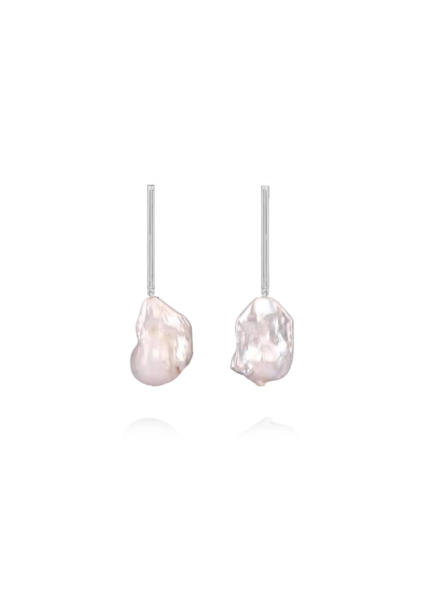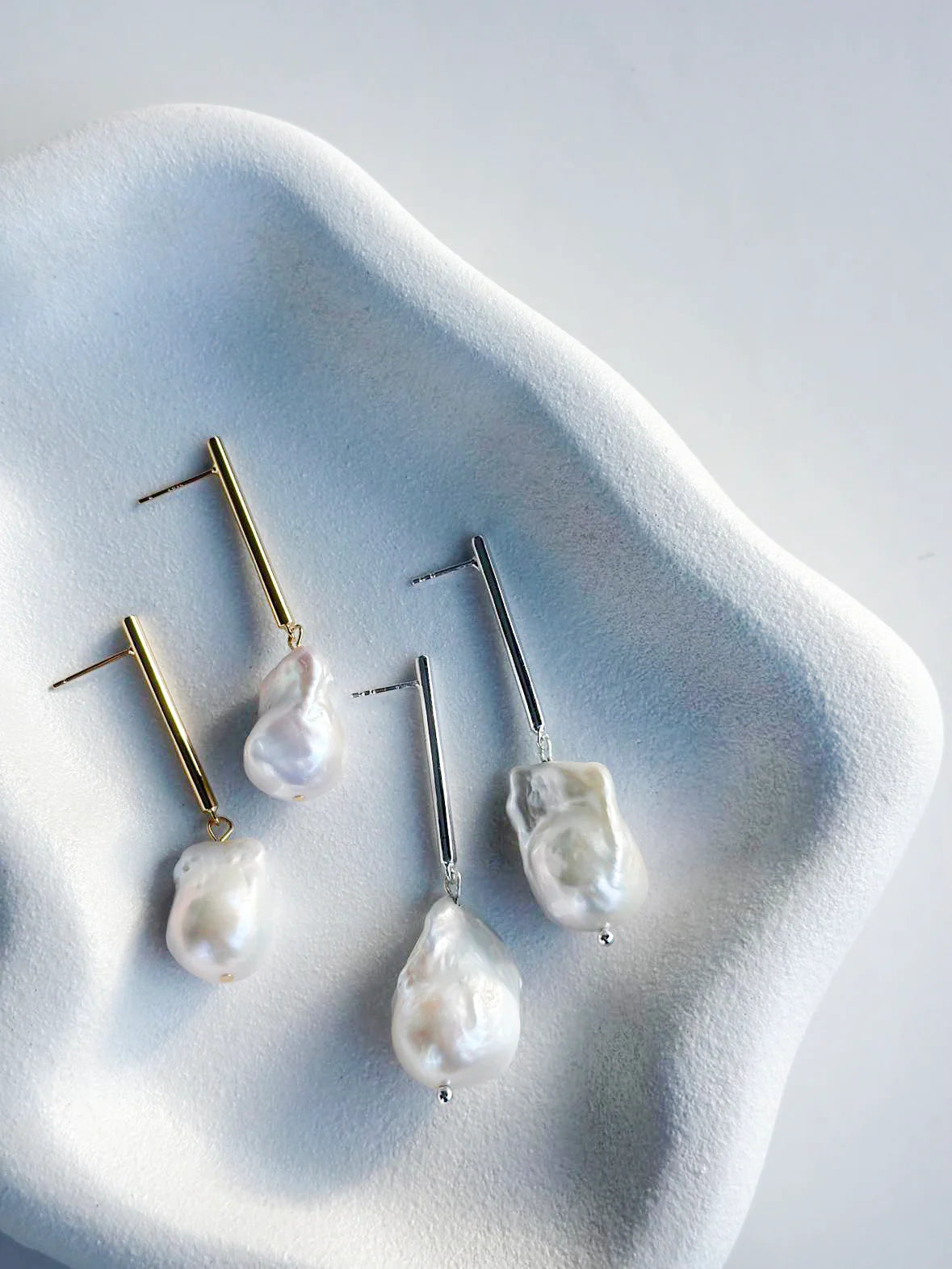 The Edie earrings are modern and luxurious and feature large baroque freshwater pearls. They are handcrafted from brass and coated in silver plating, we use 925 sterling silver posts to prevent irritation.