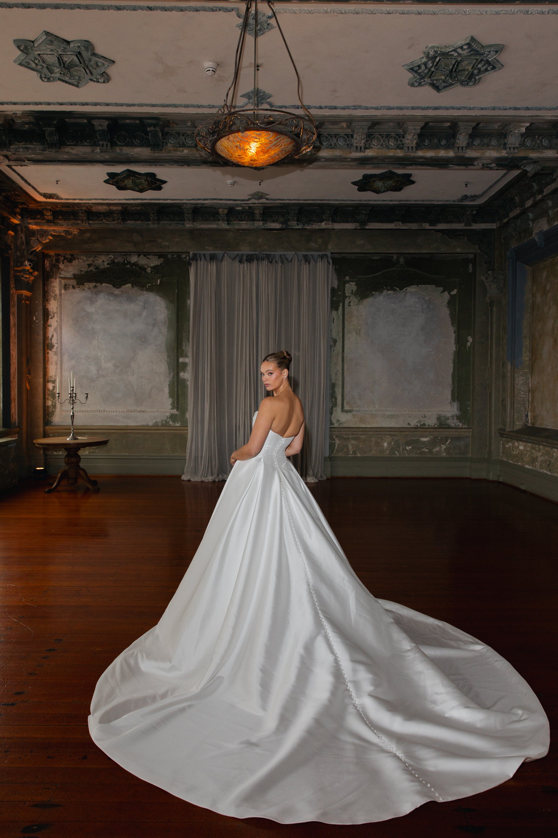 Draped in our finest Mikado fabric, Gina features the ever-popular drop-down waist, a draped bodice with an inner corset and boning for added support, and an invisible zip complemented by elegant buttons. The long, dramatic princess skirt is sure to capture attention, and adding the detachable sleeves enhances its sophisticated allure.