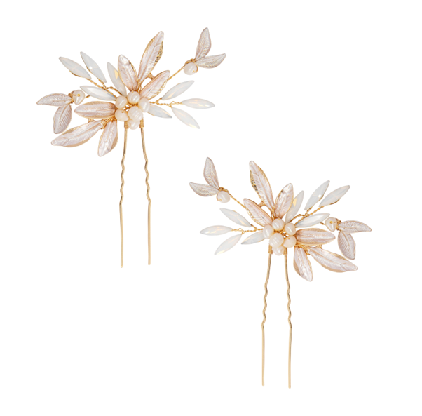 Delicate pair of opal embellished hair pins with spray of hand-painted leaves. A cluster of pearls sits in the centre. A perfect pair for any bridal look.