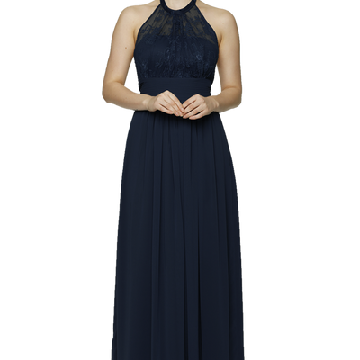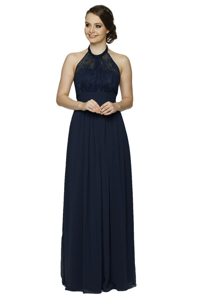 The Harlow bridesmaid gown features a soft lace halter design with a ruched waistband and soft georgette skirt. Full length and floaty she is available in 20 colours.