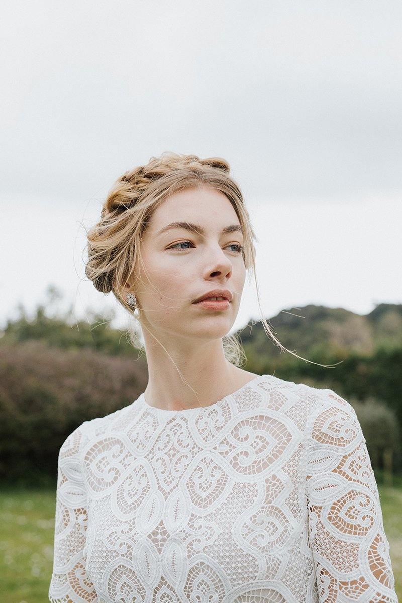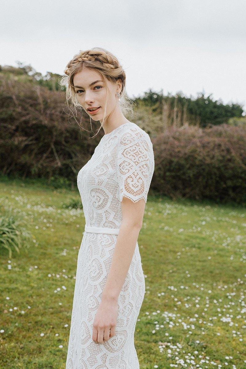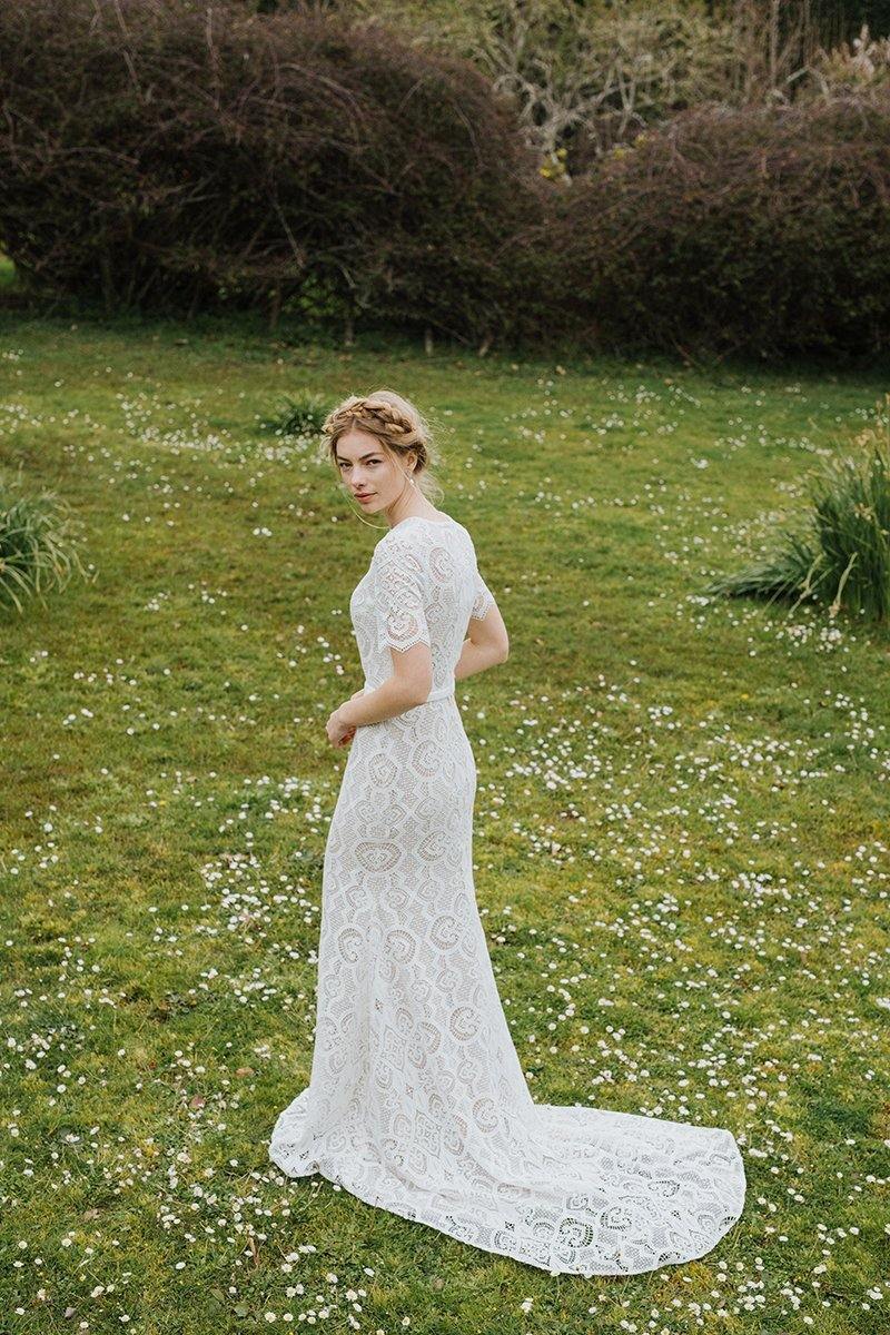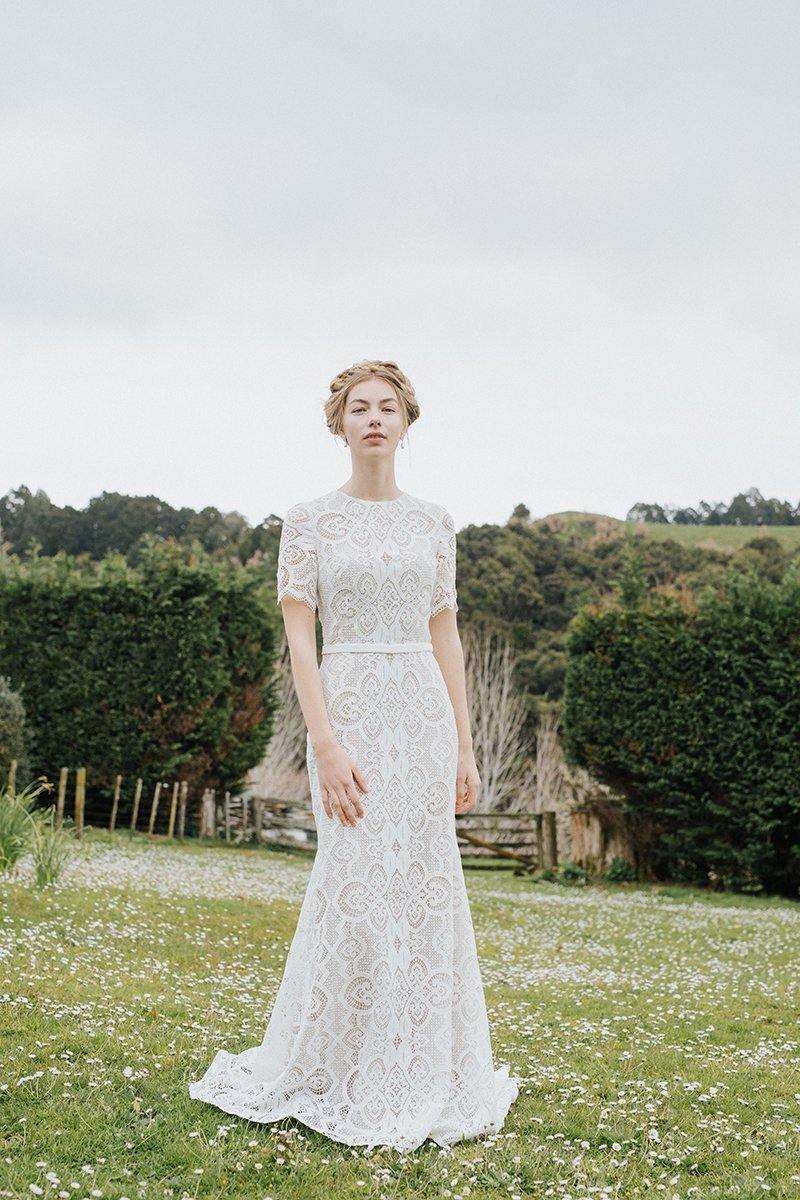 A delicate gown, with a modest neckline yet trendy short sleeves. Kaislyn skims over the body, giving a feminine silhouette. The high-waist detail, falling into a simple train gives brides the most flattering shape whilst providing the luxury of comfort and beauty.