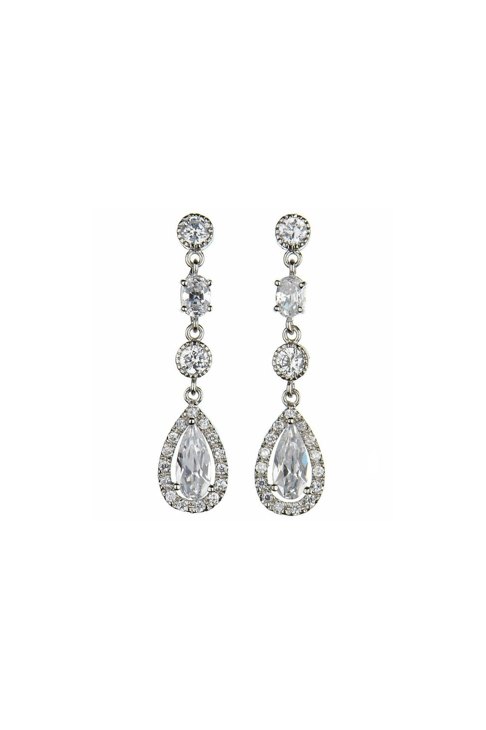 Striking teardrop cubic zirconia crystals floating in a halo of smaller gems. Each earring is 4.2cm long and dangles brilliantly from the ear for a classy bridal look.