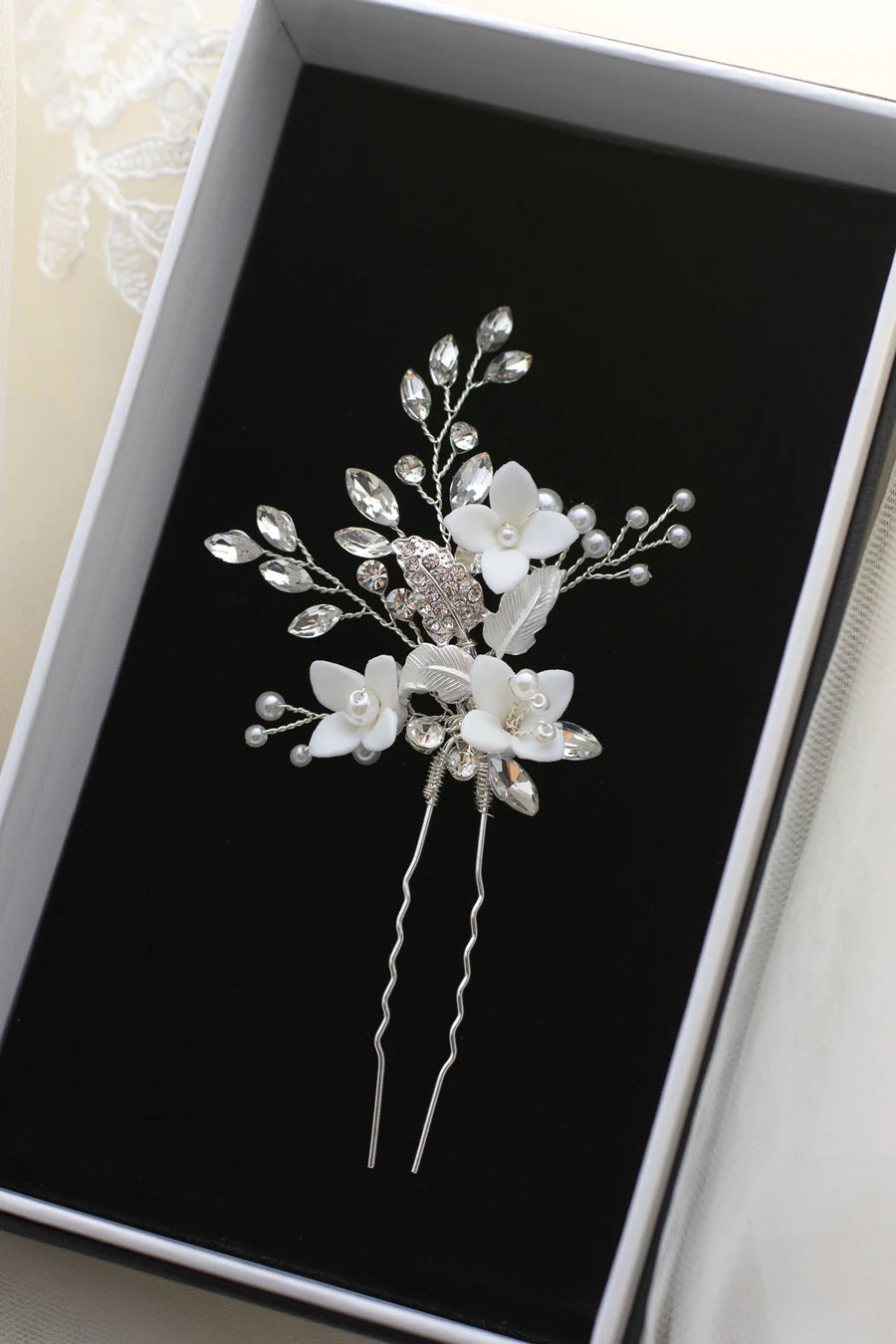 A delicate hairpin made for our minimal brides. Lilith is a beautiful hair pin featuring white porcelain flowers and spring of navette stone crystal. Perfect for Brides, Bridesmaids, Flower Girls and formal occasions.