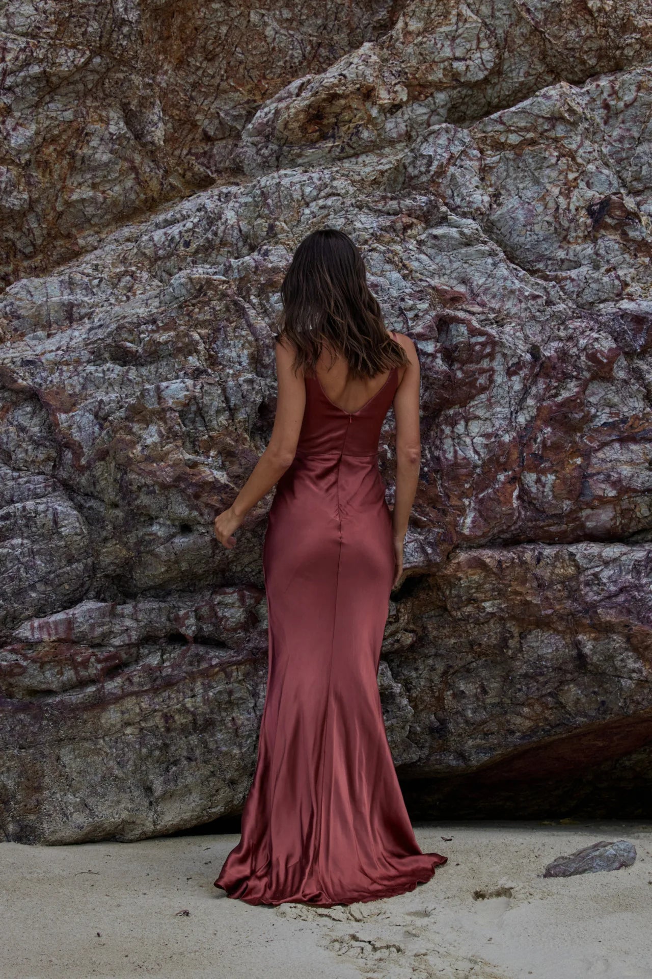 A slinky satin bridesmaid dress featuring a cowl neckline, shoestring straps and straight skirt with a short train. This gown can be mixed and matched with other styles from our range in the same fabric.