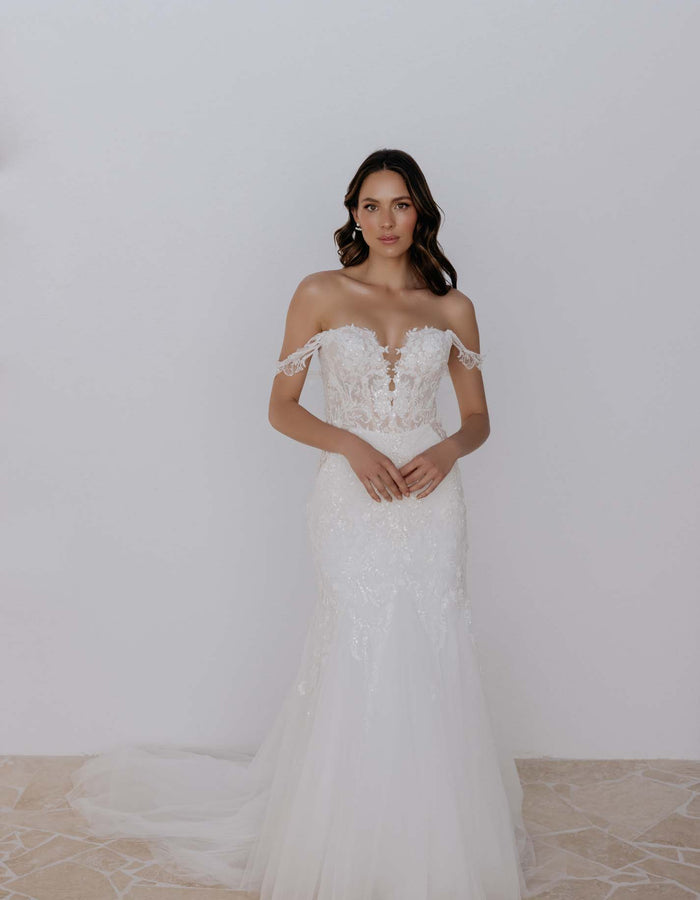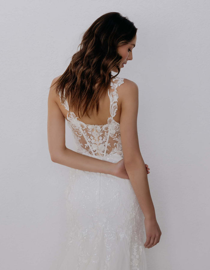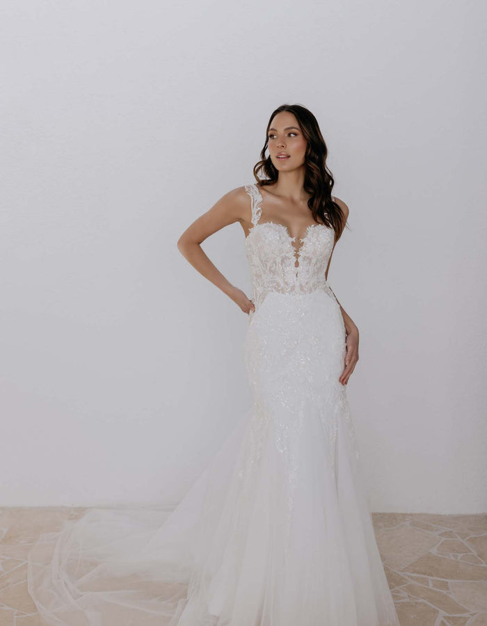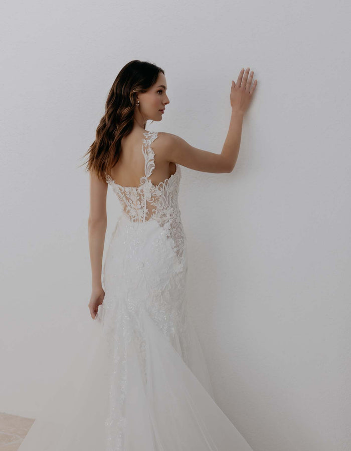 The Monique is here to give you the best of every world. With a sparkling floral detail that trails all the way from the plunging sweetheart bodice to the sultry mermaid tulle skirt and classic chapel train, she shows off a delicate look as you float down the aisle. The detailed lace straps can be worn on or off the shoulder, fitting to your personal style.